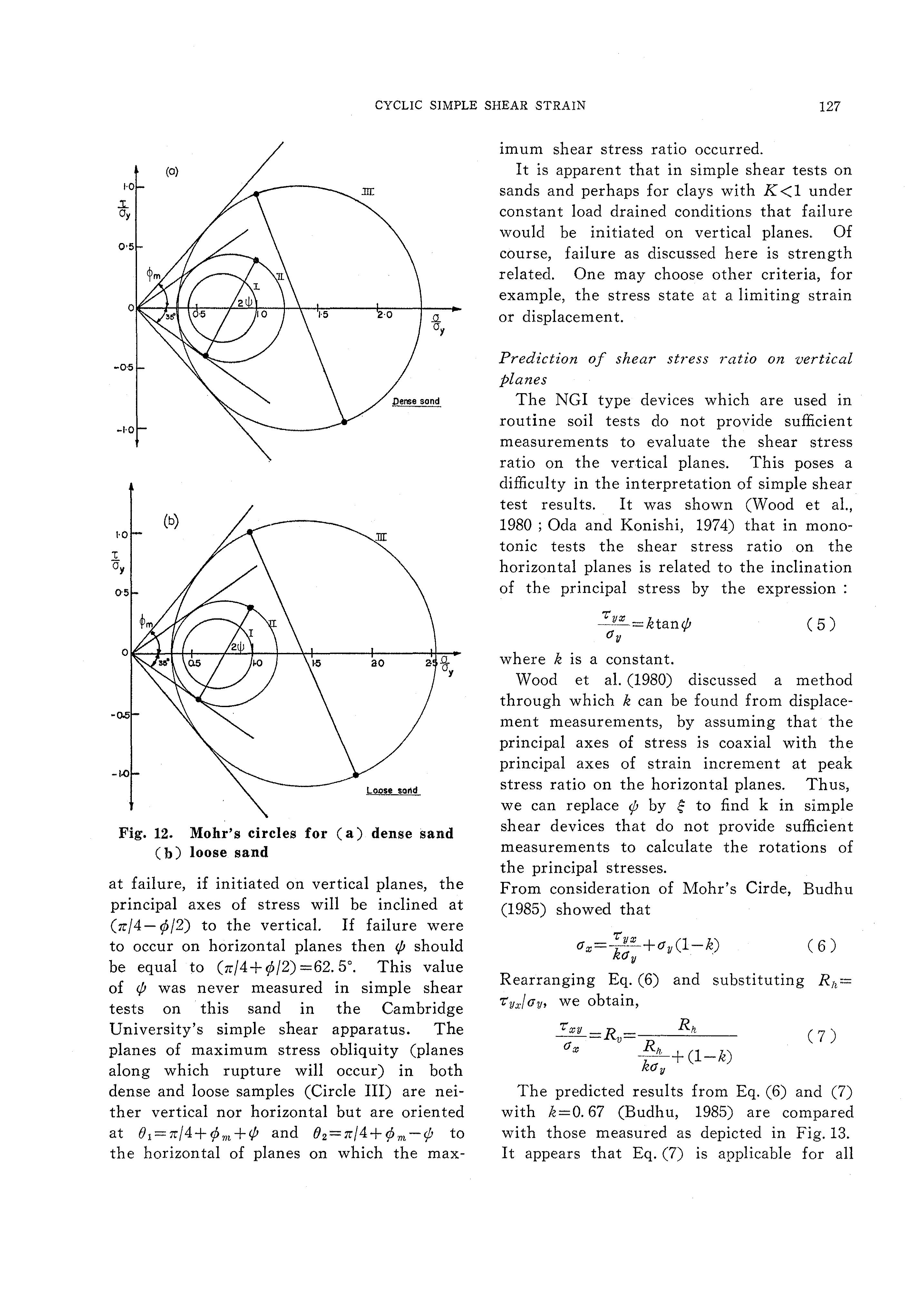 The NGI type devices which are used in routine soil tests do not provide sufficient measurements to evaluate the shear stress ratio on the vertical planes. This poses a difficulty in the interpretation of simple shear test results. It was shown (Wood et al., 1980 ; Oda and Konishi, 1974) that in monotonic tests the shear stress ratio on the horizon tal planes is related to the inclination of the principal stress by the expression : (5)