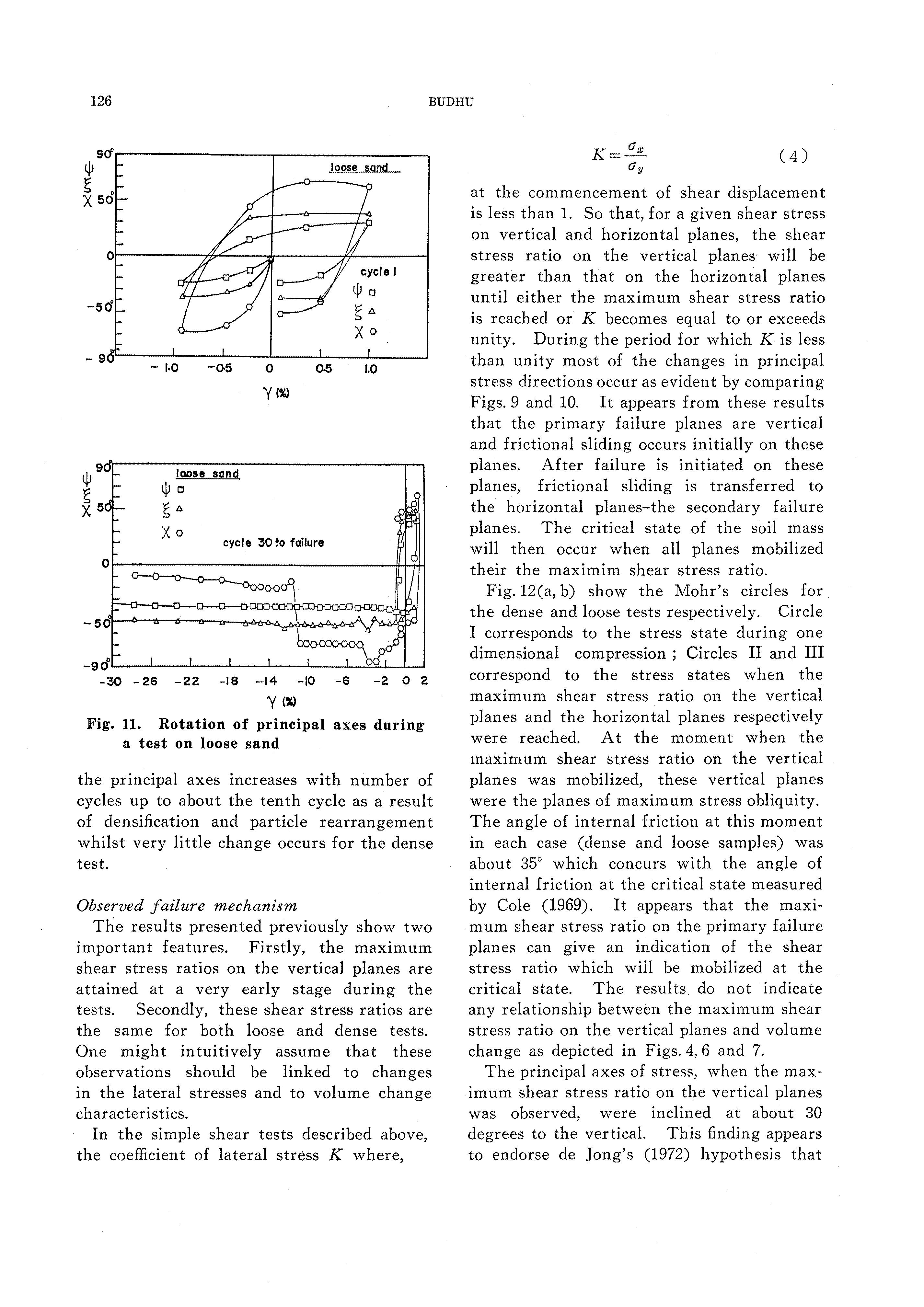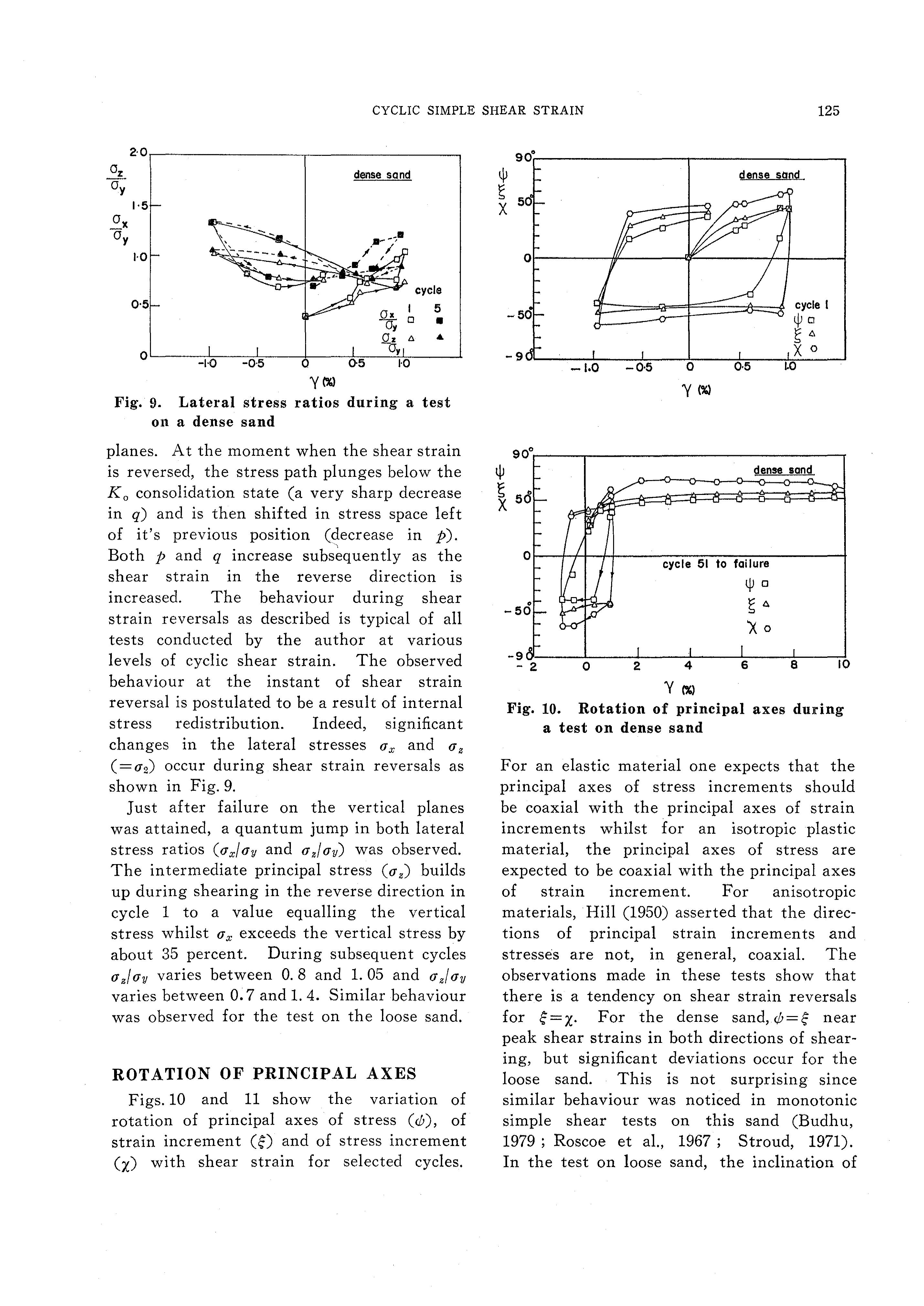 Figs. 10 and 11 show the vanatwn of rotation of principal axes of stress (dJ), of strain increment (c;) and of stress increment (x) with shear strain for selected cycles.