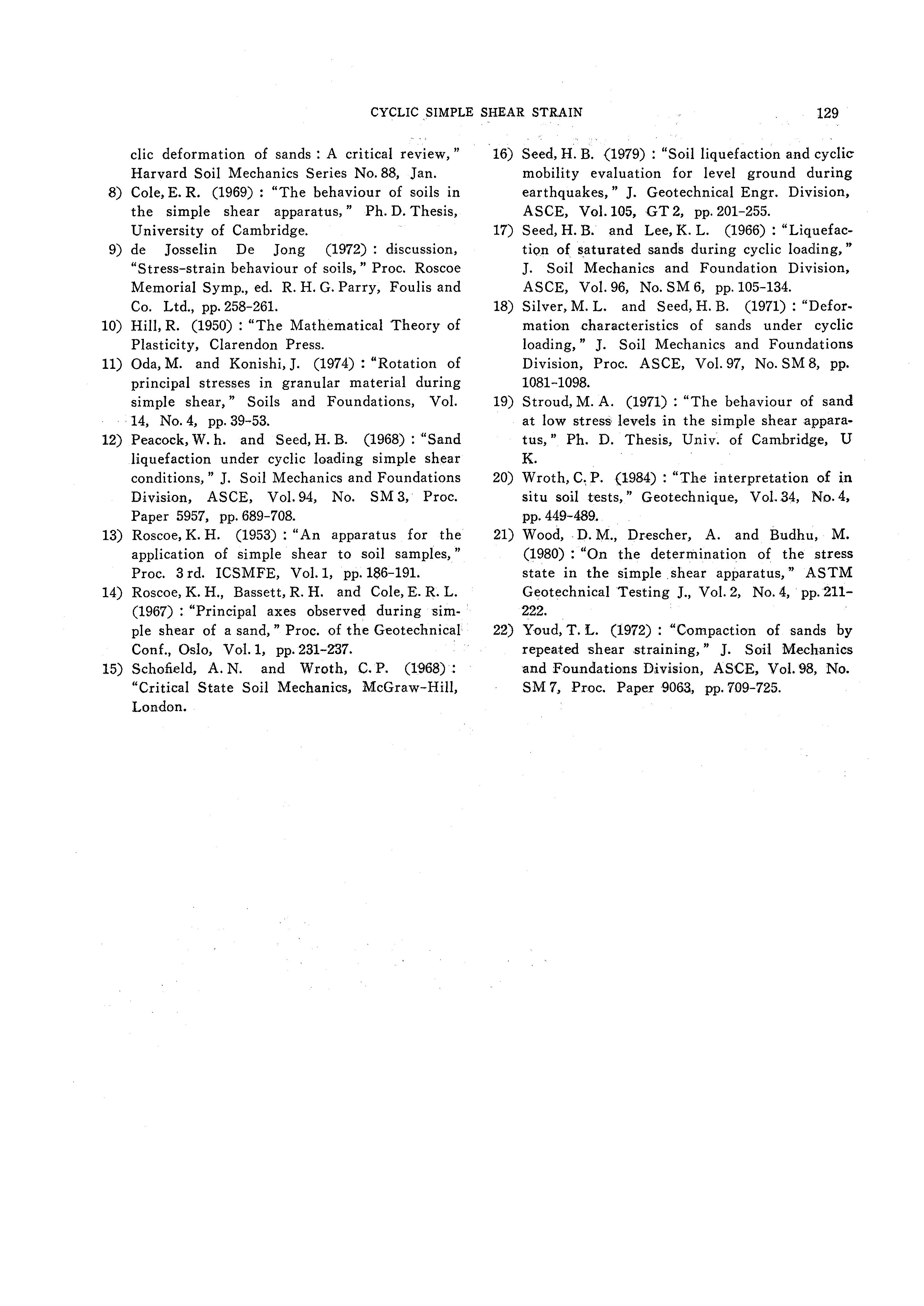 .16) Seed, H. B. (1979) : "Soil liquefaction and cyclic mobility evaluation for level ground during earthquakes," J. Geotechnical Engr. Division, ASCE, Vol.105, GT 2, pp. 201-255.
