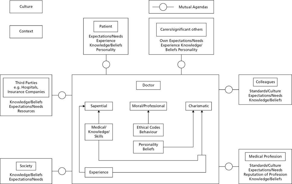 The doctor in this consultation is said to have three different forms of ‘authority’ by which is meant ‘the right to be heard’ rather than ‘the right to do what one wishes’ ‘sapiental’, ‘moral’, ‘charismatic’ (Chapter 1 in Pendleton et al., 1984). This translates into roles or functions (see Figure 1.1). ‘Sapiental’ authority is the authority that a doctor derives from her knowledge, skills, experience, and expertise; the consequent role or function would be her knowledge of medical conditions and how to recognize and treat them. ‘Moral’ authority refers to the authority doctors receive from society due to their adherence to a code of ethics placing the patient’s interests and care above all other interests as well as a ‘professional’ set of behaviours such as being respectful, attentive, willingness to attend patients