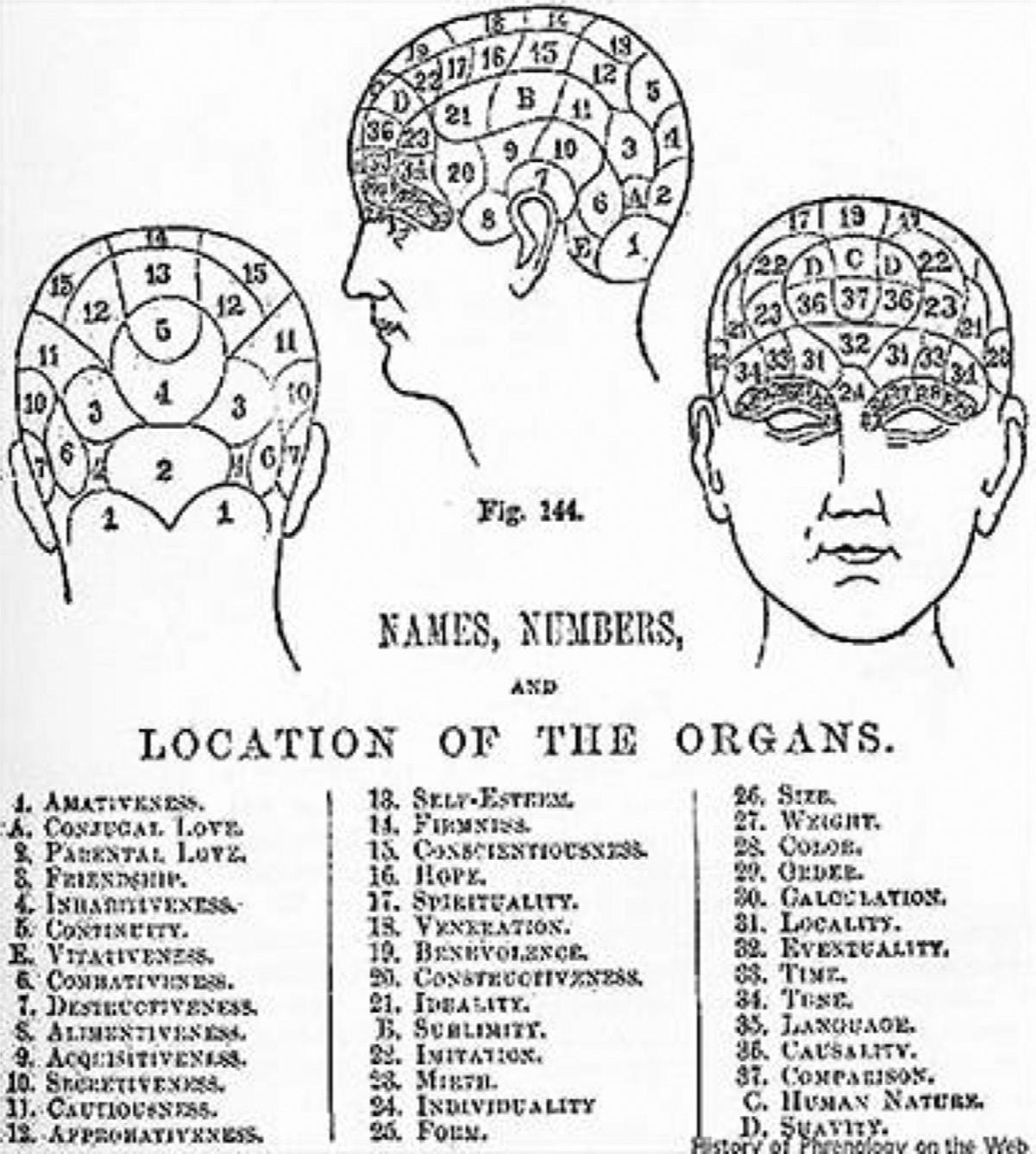 Fig. 1.1 Regions of phrenology. (Diagram from W. Mattieu Williams, A Vindication of Phrenology. London, 1894. Obtained through Van Wyhe, John. “The History of Phrenology on the Web.” http://www.historyofphrenology.org.uk/texts/2002van_wyhe.htm.)