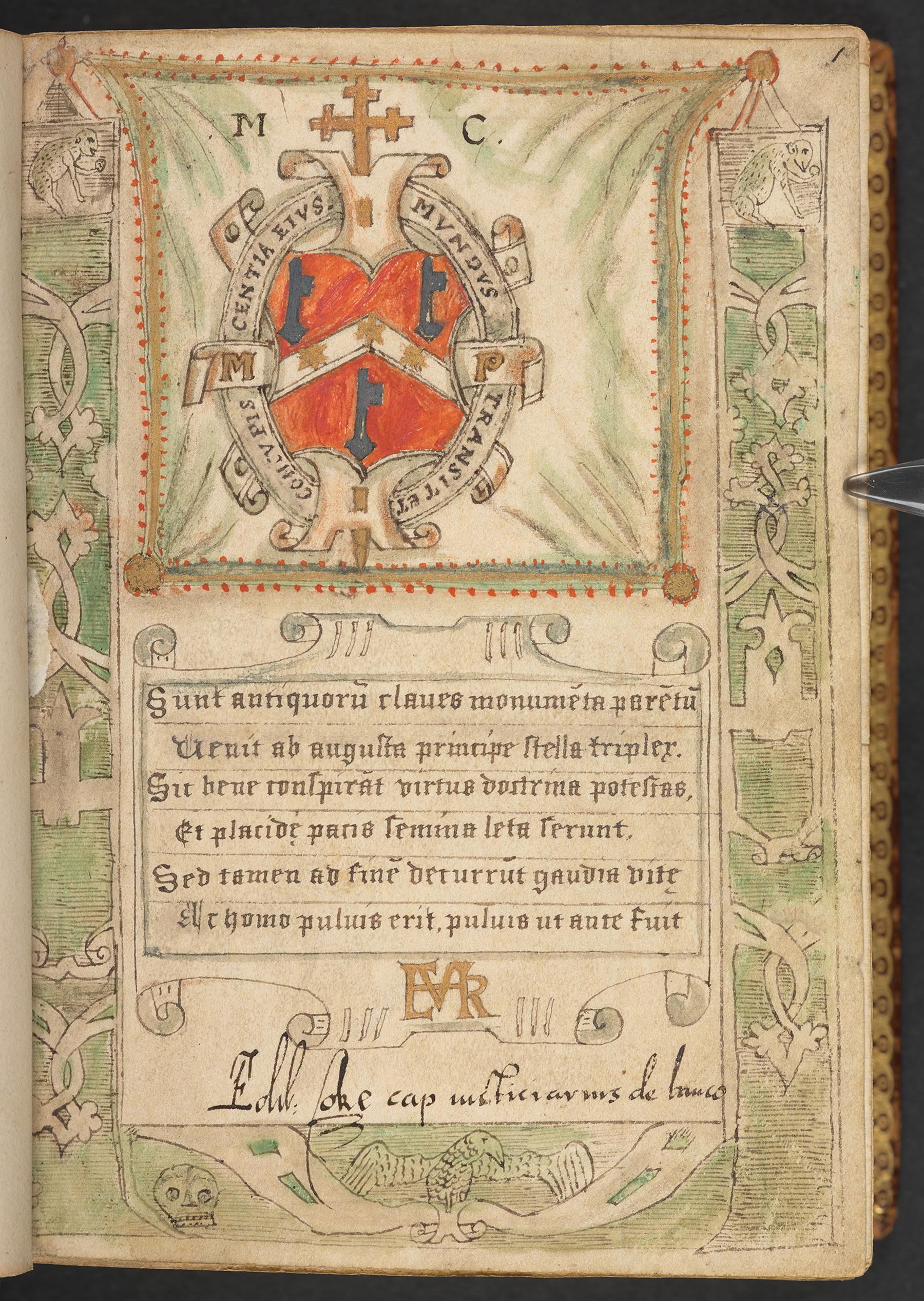 London, BL, MS. Add. 49366, fo. 3r: the elaborate frontispiece commissioned by Matthew Parker, archbishop of Canterbury, when he acquired this late twelfthcentury legal compilation of unknown provenance. The book consists of a copy of Quadripartitus, amplified in the twelfth century with other materials. It was highly unusual for Parker to provide a frontispiece for one of his medieval manuscripts. The poem which is featured on the frontispiece was written by Walter Haddon, a civil lawyer, Latin poet, and associate of Parker. It is identified and printed below, p. 340 n. 45. The book later came into the hands of Sir Edward Coke, whose flamboyant signature is scrawled across the bottom of Parker’s frontispiece. It remained in his library at Holkham Hall until the twentieth century, and is often referred to as the Holkham Book. Reproduced by permission of the Trustees of the British Library.