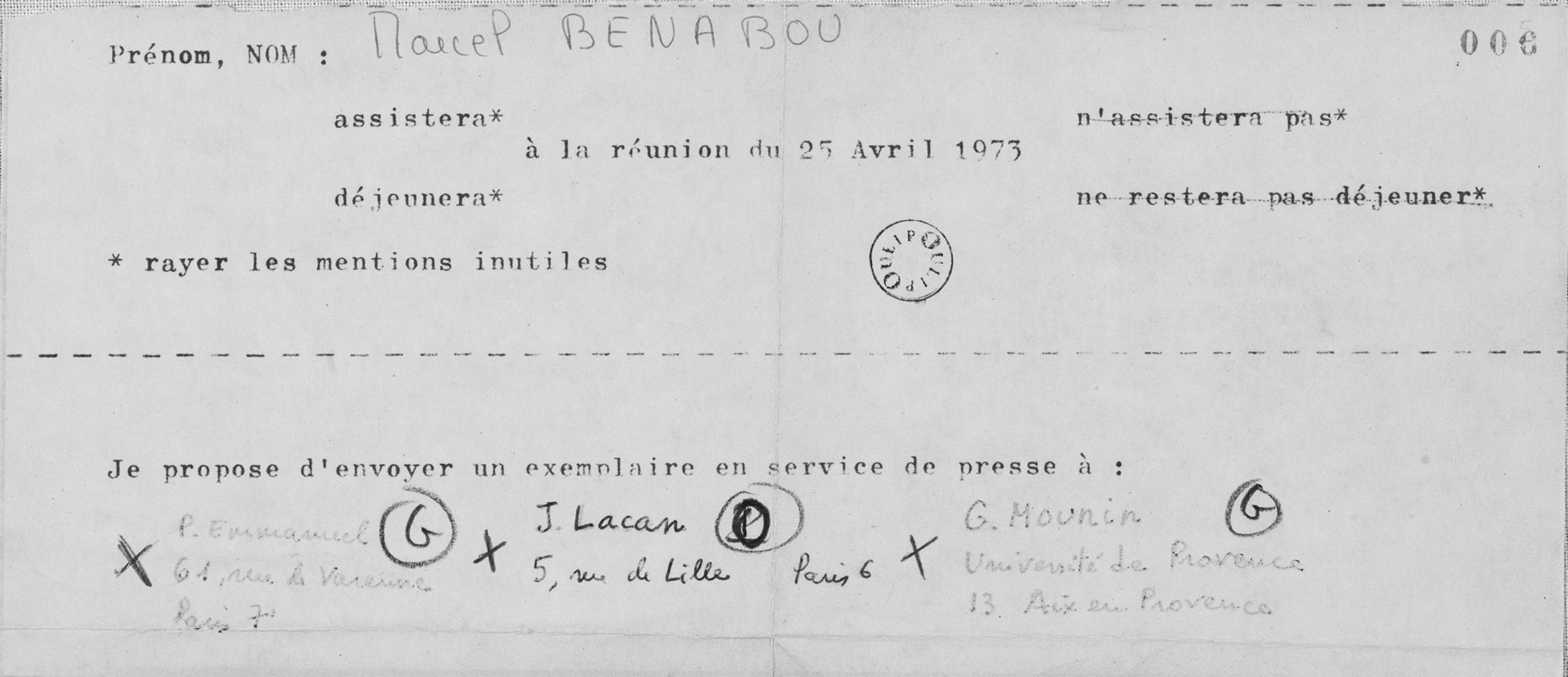 Fig.2. Bénabou’scompletedsliprequestingthathisfriendJacquesLacanshould receiveacomplimentarycopyof LaLipo.(FO,DM-3(28)).