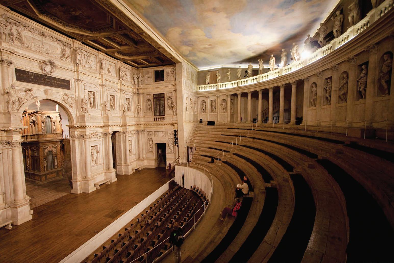 ( –)wasdesignedbyAndreaPalladioandVincenzo Scamozzi.Thestageandsemi-circularseatingwereinspiredbythedescriptionofanancient theatreinVitruvius’ OnArchitecture.TheperspectivalscenerywasaRenaissanceinnovationbased ontheworkofSebastianoSerlio.Thetheatreisstillusedforplaysandconcerts.