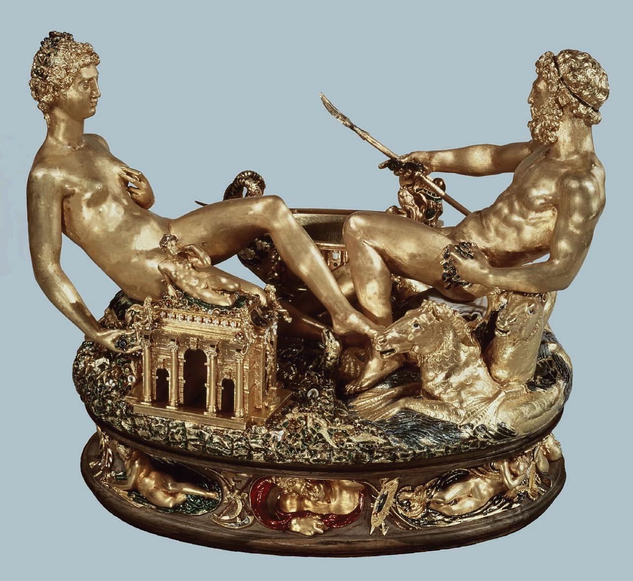 ,goldandenamelsaltcellar(–).Thefemale figureofTellusrepresents earth;thetemplebesideherheldpepper.Themale figureofNeptunerepresentsthesea;the shipbesidehimheldsalt.The figuresinthebaserepresentthewinds,thetimesoftheday,and humanactivities.