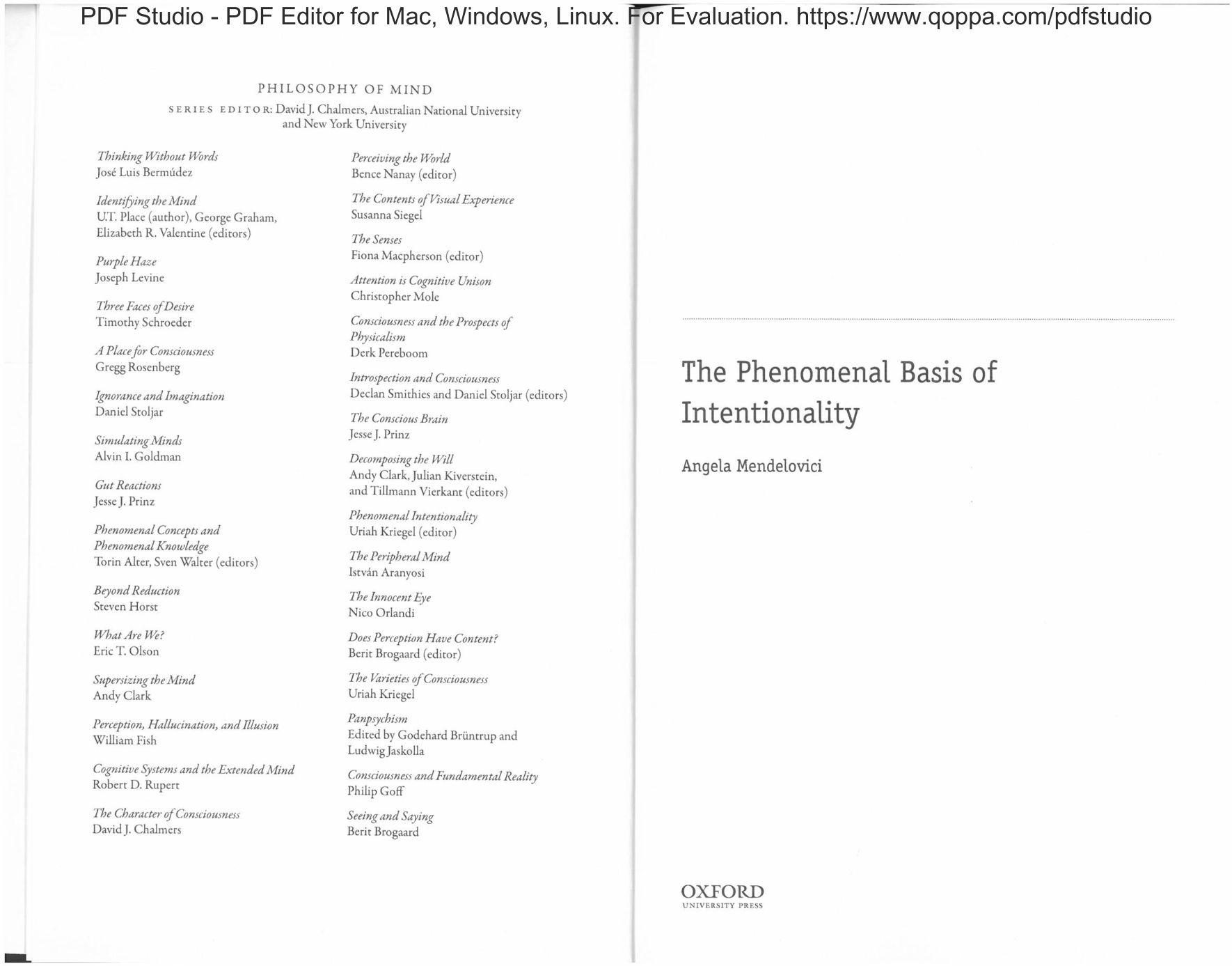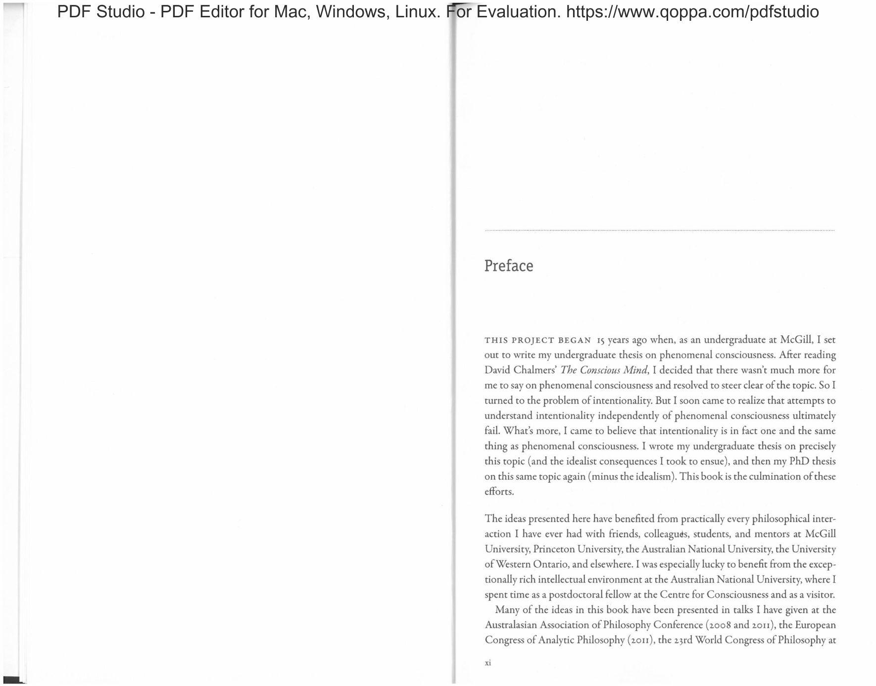 THIS PROJECT BEGAN 15 years ago when. as an undergraduate at McGill, I set out to write my undergraduate thesis on phenomenal consciousness. After reading David Chalmers’ The Curm.’iau.r 1‘l/find. I decided that there wasn’t much more for me to sayon phenomenal consciousness and resolved to steer clear ofthe topic. So I turned to the problem of intentionality. But I soon came to realize that attempts to understand " y‘ ‘ I ’ ‘y of‘ L " ‘I fail. What's more, I came to believe that intentionality is in fact one and the same thing as phenomenal consciousness. I wrote my undergraduate thesis on precisely this topic (and the idealist consequences I took to ensue), and then my PhD thesis on this same topic again (minus the idealism). This book is the culrnimtion ofthese eilorts.