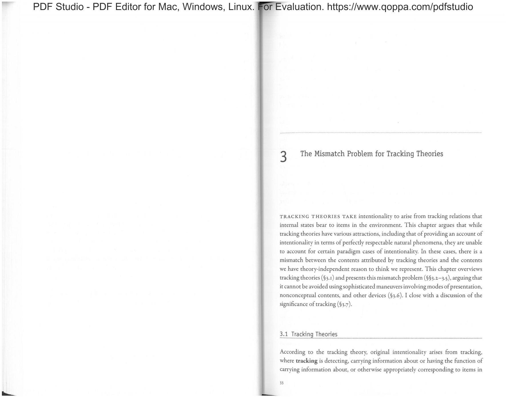 TRACKING Tl-IEORIES TAKE intenrionality to arise from tracking relations that internal states bear to items in the environment. This chapter argues that while tracking theories have various attractions, including that of providing an account of intentionality in terms ofperfecrly respectable natural phenomena, they are unable to account for certain paradigm cases of intentionality. In these cases, there is :1 mismatch between the contents attributed by tracking theories and the contents we have theory-independent reason to think we represent. This chapter overviews tracking theories (§3. 1) and presents this mismatch problem (§§;.2.—;.5), arguing that it cannot be avoided usingsophisticated maneuver involving modes ofpresentation, nonconceptual contents. and other devices (§3.6). I close with a discussion of the significance ofrracking (§;.7).