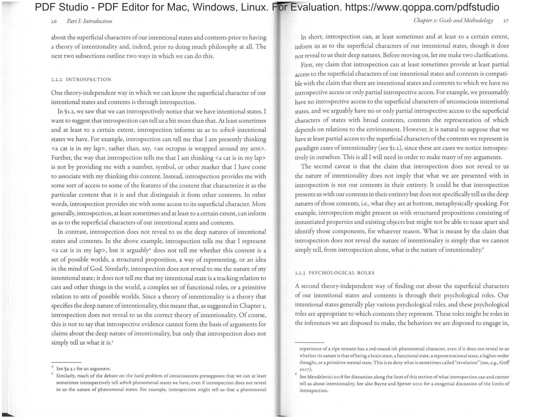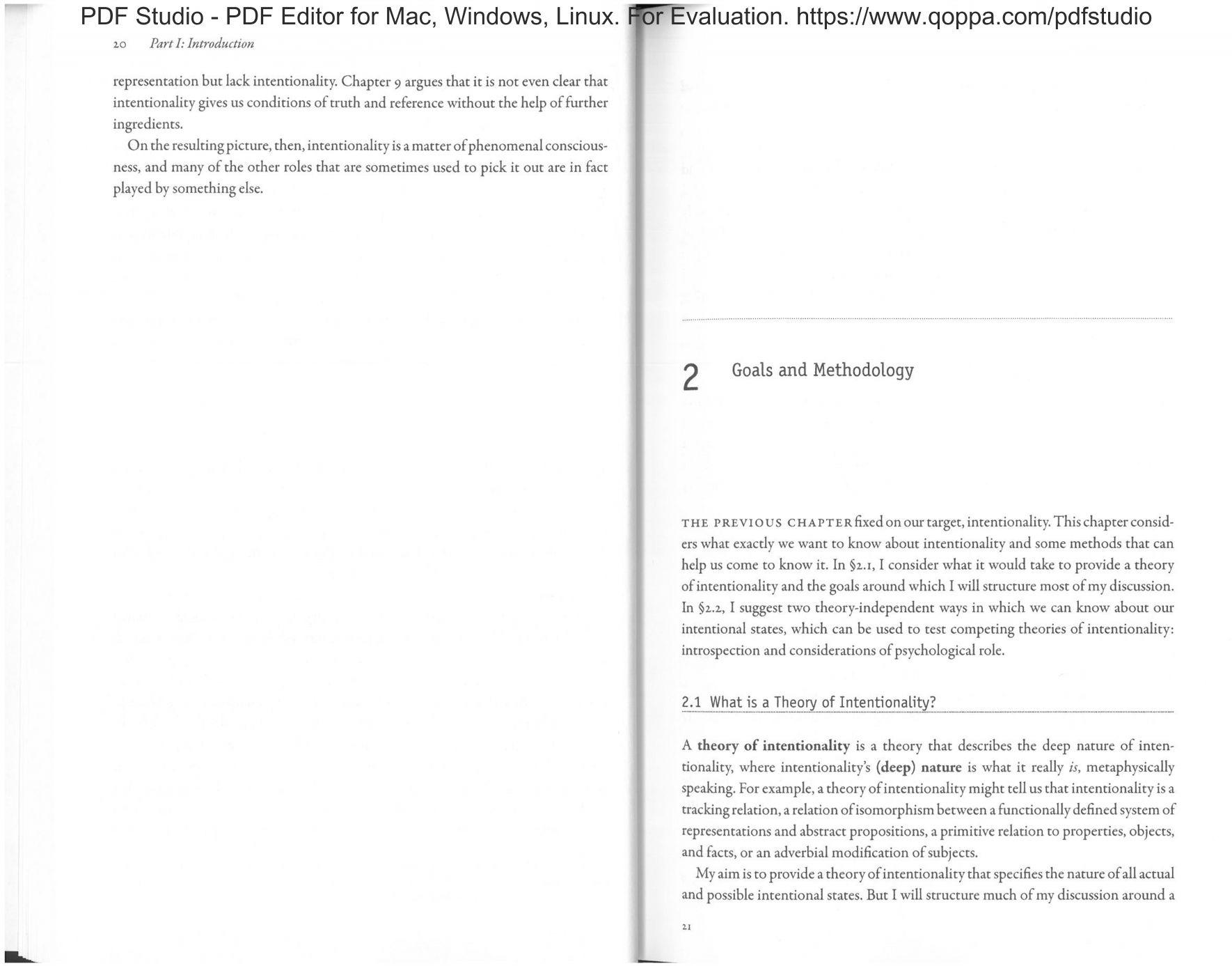THE PREVIOUS cHAi='n-:RfixerI on our target, intentionality. This chapter considers what exactly we want to know about intentionality and some methods that can help us come to know it. In §2..t, I consider what it would take to provide a theory ofintentionality and the goals around which I will structure most of my discussion. In §1..2, I suggest two theory-independent ways in which we can know about our intentional states, which can be used to test competing theories ofintcntionality: introspection and considerations ofpsychological role.