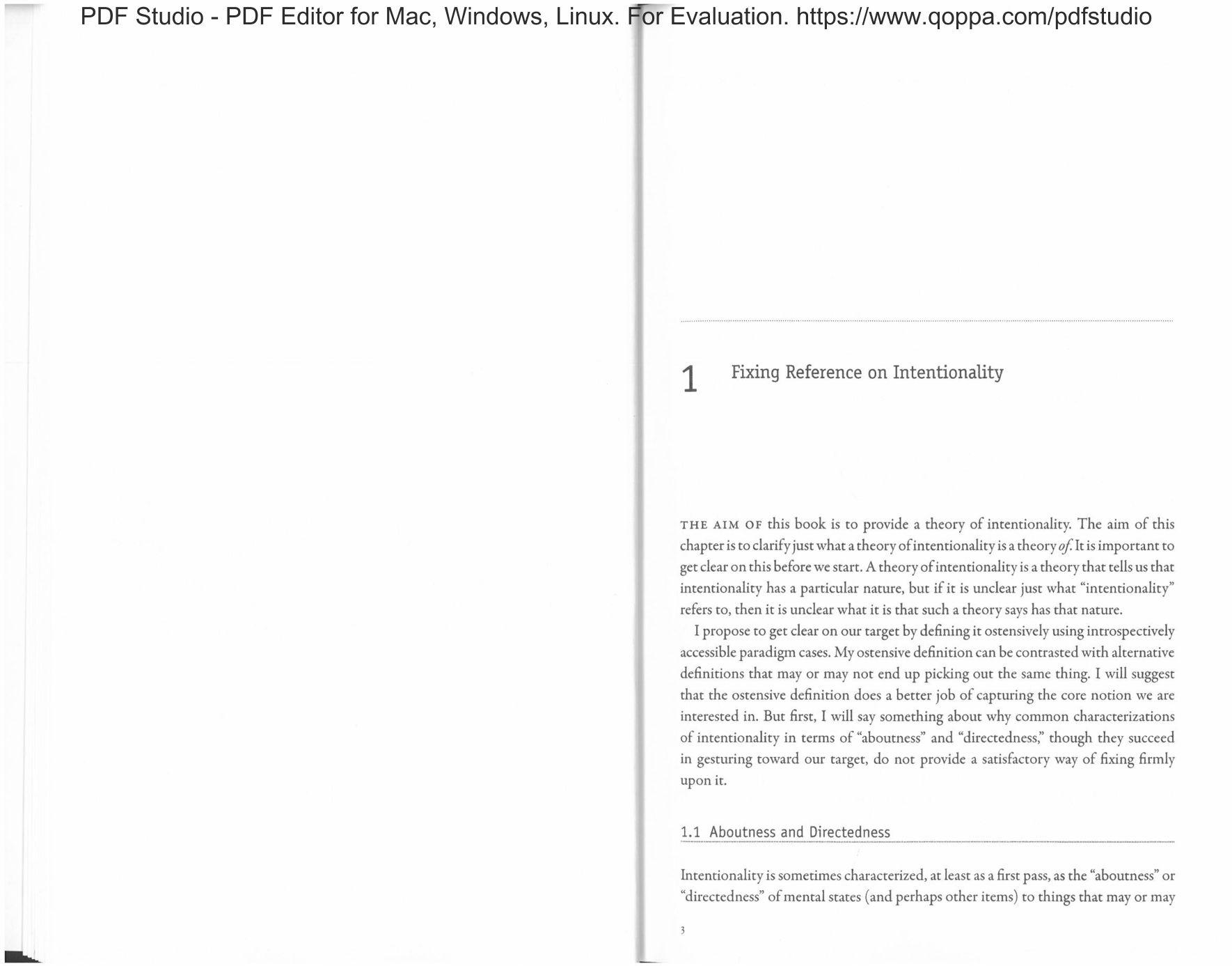 My target, inrenrionality, can be understood as the observed "aboutness" or "directedness" ofrnental states. We inrrospectively notice that many mental states in some way or other seem to “present,” “represent,” or be “about” things. For example, you might notice that your current visual experiences represent a page before you, some marks olivarious shapes and colors, and perhaps the words that these marks form. You might also notice that your current thoughts represent that there is a page with marks and words before you, something to do with your own mental states, or a need for a cup ofcoffee. lnrentionaliry, roughly, is this phenomenon ofaboutncss or directedness that \ve notice in these and other everyday cases.