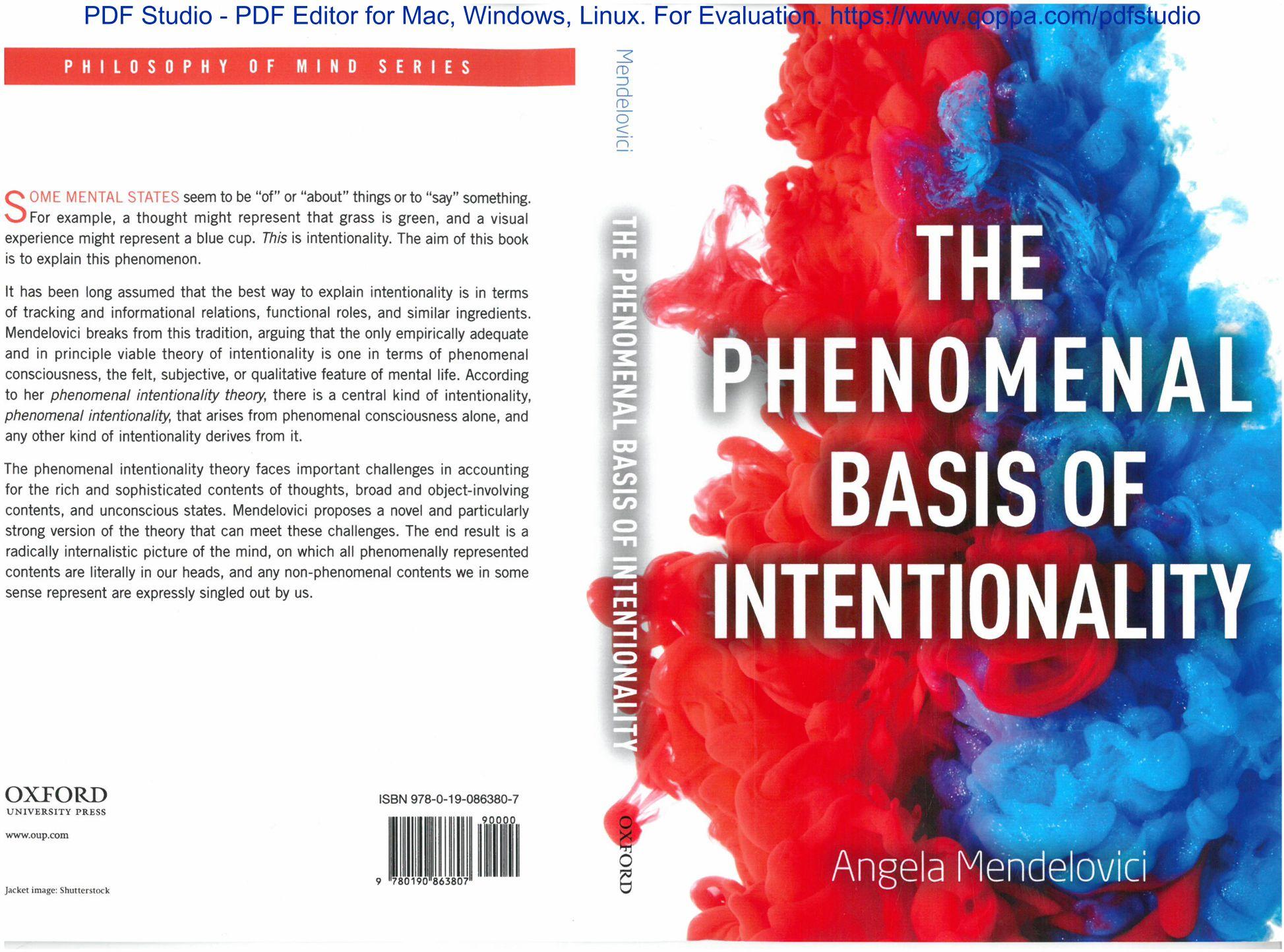 It has been long assumed that the best way to explain intentionality is in terms of tracking and informational relations, functional roles, and similar ingredients. Mendelovici breaks from this tradition, arguing that the only empirically adequate and in principle viable theory of intentionality is one in terms of phenomenal consciousness. the felt. subjective, or qualitative feature of mental life. According to her phenomenal intentronafily theory. there is a central kind of intentionality. phenomenal intentionality, that arises from phenomenal consciousness alone, and any other kind of intentionality derives from it.