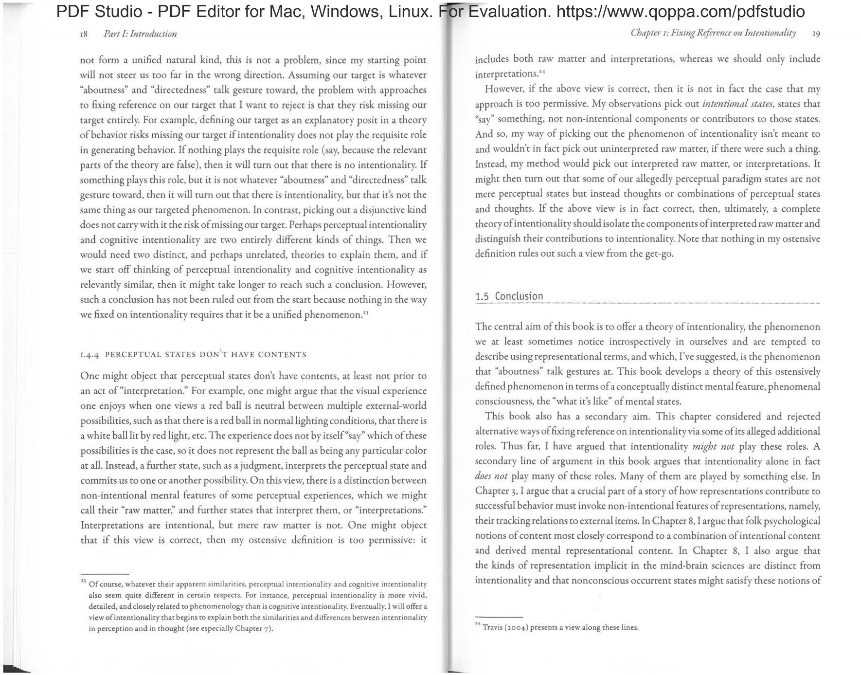 However, if the above view is correct. then it is not in fact the case that my approach is too permissive. My observations pick out intentional states, states that “say” something, not non-' ' components or contributors to those states. And so, my way of picking out the phenomenon of intentionality isn't meant to and wouldn't in fact pick out unintcrpreted raw matter. if there were such a thing. Instead, my method would pick out interpreted raw matter. or interpretations. It might then turn out that sotne of our allegedly perceptual paradigm states are not mere perceptual states but instead thoughts or combinations of perceptual states and thoughts. If the above view is in fact correct, then, ultimately, a complete theory of intentionality should isolate the components of interpreted raw matter and distinguish their contributions to intentionaliry. Note that nothing in my ostensive definition rules out such a view from the get-go.