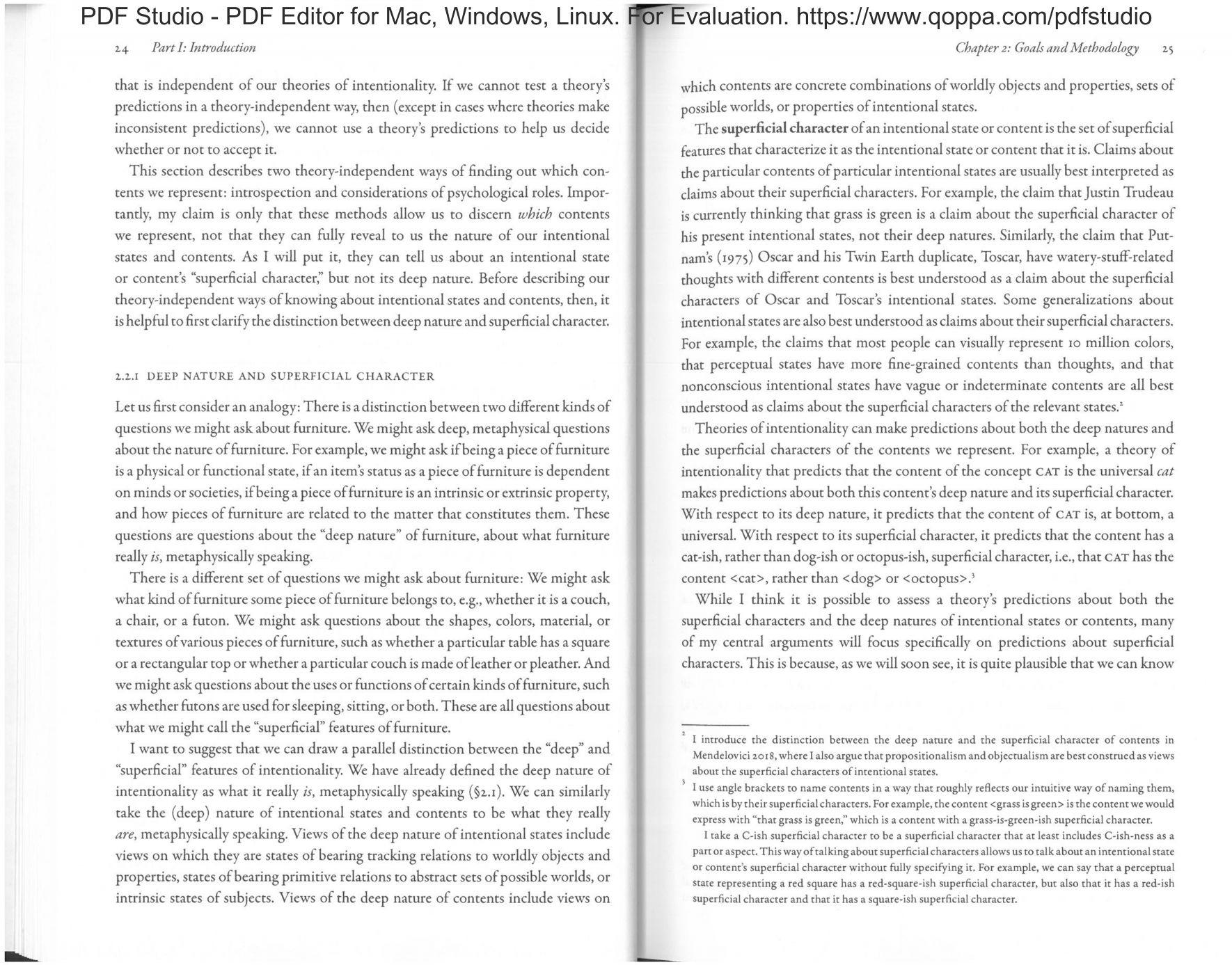 While I think it is possible to assess a theory's predictions about both the superficial characters and the deep natures of intentional states or contents, many of my central arguments will focus specifically on predictions about superficial characters. This is because, as we will soon see, it is quite plausible that we can know