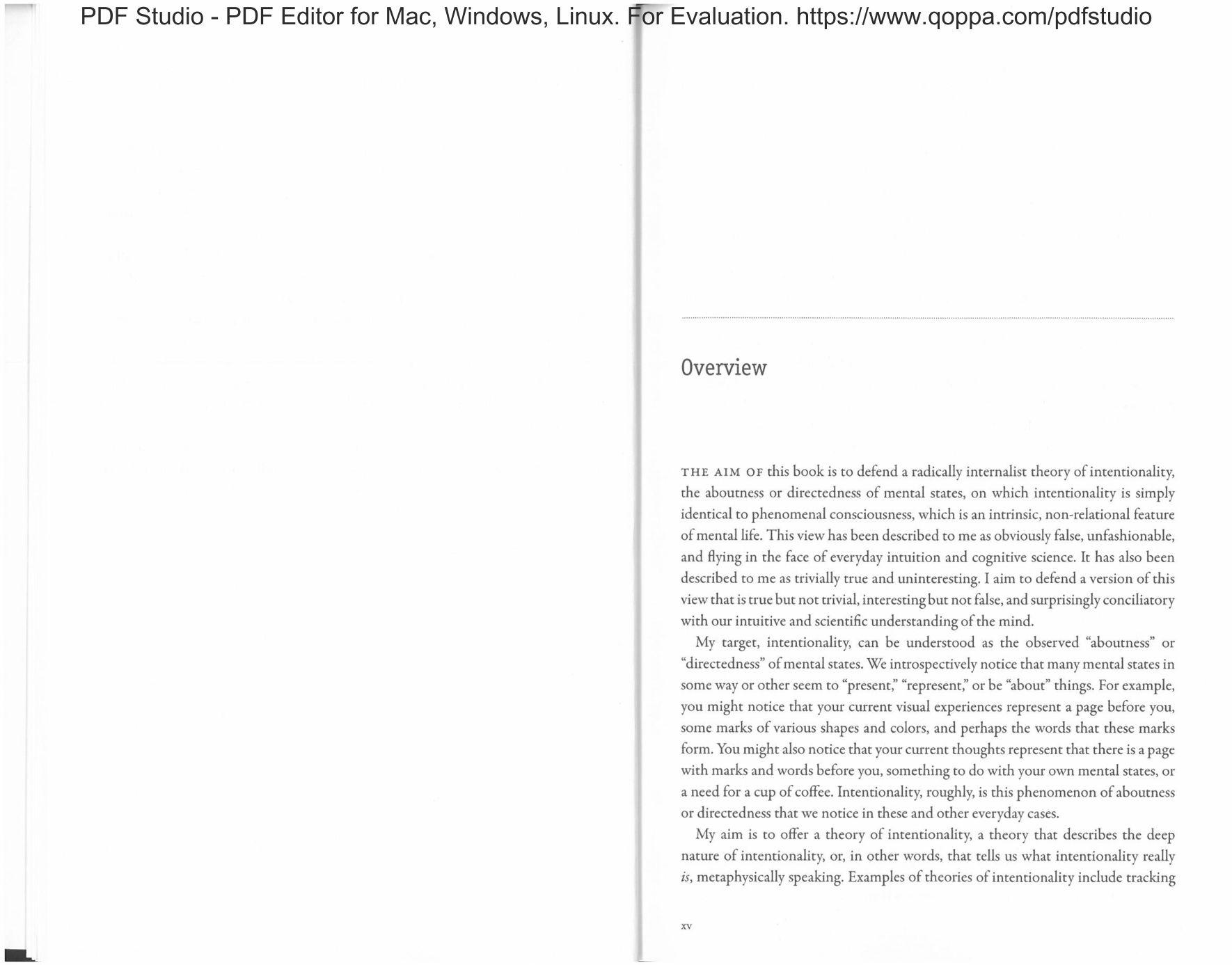 rm: AIM or this book is to defend a radically internalist theory ofintentionality, the aboutness or directedness of mental states, on which intenrionality is simply identical to phenomenal consciousness, which is an intrinsic, non-relational feature ofmental life. This View has been described to me as obviously false, unfashionable. and flying in the face ofeveryday intuition and cognitive science. It has also been described to me as trivially true and uninteresting. I aim to defend a version of this view that is true but not trivial, interesting but not false, and surprisingly conciliatory with our intuitive and scientific understanding ofthe mind.