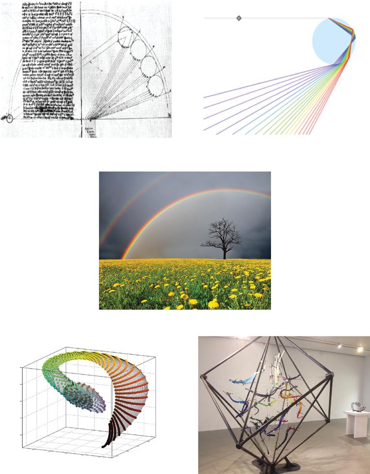 Colour Plate J. (a) Theodoric’s diagram of the formation of the rainbow through double-refraction and reflection of sunlight in raindrops towards an observer; MS Basel F. IV. 30, ff. 33v-34r. (b) a modern illustration of the dispersion in angles of refracted and reflected light within a raindrop. (c) A primary and secondary rainbow https://www.pinterest.com.au/ pin/232287293250306356/?autologin=true. (d) and (e) Art installation by Colin Rennie, Sunderland Art Museum ‘Illuminating Colour’. (b) and (d) reproduced with permission of Prof. Hannah Smithson