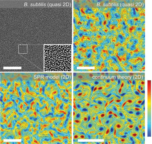 Colour Plate A. Experiments (A—microscopy and B—a plot of velocity contours and vorticity strength in colour scale) and models (C—a mesoscopic model and D—a continuum theory) of a turbulent quasi-2D flow of dense swimming bacteria (B. subtilis). Reproduced with permission from Wensink, H. H. et al. (2012), ‘Mesoscale turbulence in living fluids’, Proceedings of the National Academy of Sciences, 109, 14308–14313