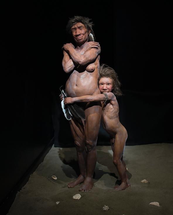 composition that had the two Neanderthals together. It was a first for them, to put two sculptures together, and it worked. We knew that the Neanderthals whose skulls had been found were probably not even contemporaries but it was a way of telling a story. We decided that the Gibraltar 1 female would be Flint’s grandmother, so she became Nana. And so Nana and Flint were born.