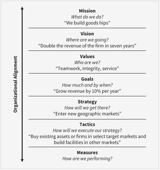 While strategic planning focuses on courses of action, strategic management involves a broader, more systemic perspective that includes but is not limited to the organization’s strategy. Like the terms strategic planning, strategic management, and strategic thinking, we have all heard the terms mission, vision, values, goals, strategy, tactics, and measures. Again, depending upon whom you ask, these terms often mean different things to different people. Accordingly, let’s do some level-setting about the definitions used in this text for each of these components of a firm’s strategic management system (see Figure I.1).