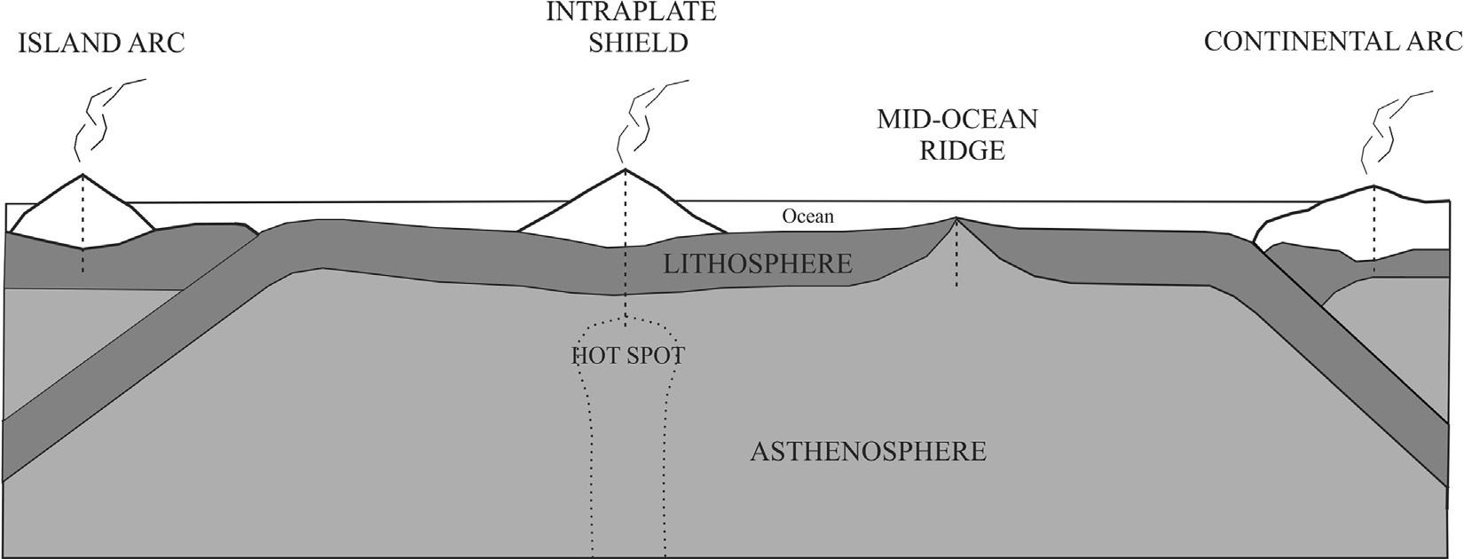 FIG.1.7Volcanoesandplatetectonics.Volcanoesresultingfromdifferingplatetectonicsettings. ModifiedfromaUS GeologicalSurveydiagraminSimkin,T.,Tilling,R.I.,Vogt,P.R.,Kirby,S.H.,Kimberly,P.,Stewart,D.B.,2006.This dynamicplanet:worldmapofvolcanoes,earthquakes,impactcraters,andplatetectonics.U.S.Geol.Surv.Map I-2800,scale1:30,000,000.https://volcano.si.edu/learn_dynamicplanet.cfm.