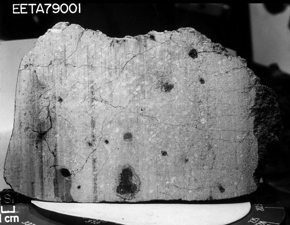 FIG.1.8Martianmeteorite.Sawedfaceofabasalticshergottitemeteorite,thefirstmeteoriteidentifiedhaving Martianatmospheretrappedinsidetheglassyportionsofthemeteorite.1cmcube,at lowerleft.Recoveredfrom ElephantMoraineinAntarcticaduringthe1979collectingseason. NASAphotoS80-37631.