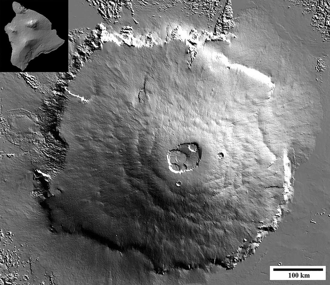 FIG.1.2OlympusMonsvolcano.ShadedreliefrenditionsofOlympusMonsonMars(NASAMarsOribterLaser Altimeterdata)andtheBigIslandofHawai’i(upperleft;NASAShuttleRadarTopographyMissiondata).Both imagesareshownatthesamescale.