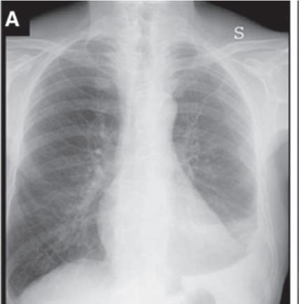 use of digital tomosynthesis in these situations. Additional views of the chest may be required in special instances. Shallow oblique radiographs (15 degrees) may be useful in confirming the presence of a suspected nodule. Forty-five–degree oblique radiographs can be used for the detection of asbestos-related pleural plaques. Apical lordotic views project the clavicles above the chest, improving visualization of the apices and the middle lobe, particularly in cases of middle lobe atelectasis. Lateral decubitus radiographs (Fig. 1.3) can be used to determine the presence or mobility of pleural effusion and to detect small pneumothorax, particularly in patients who are confined to bed and unable to sit or stand erect. A PA radiograph done with nipple markers is useful