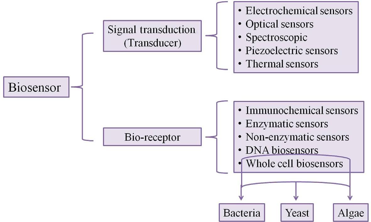 Biosensorsareanalyticalhybriddevicesthatcanprovidespecificqualitativeorsemiquantitativedatabyintegratingbiologicalorbiomimeticdetectionelement.Thedetectionelementisusuallybiologicalinnaturealongwithatransducer.Thetransducer convertsabiochemicalphenomenonintoanelectricalsignal [5,6].Thisapproach exploitsthemolecularbindingeventandalsobringsresearchersfromdifferentareas ofscienceandengineeringtogetheronacommonplatform.Pastdecadehasseentremendousriseindevelopmentofnoveltoolsforefficientenvironmentalmonitoring.Clark andLyonswerepioneersinbiosensorsdevelopmentresearch.Later,UpdikeandHicks developedthefirstenzyme-basedbiosensorintheyear1967,whereanoxygenelectrode hadpolyacrylamideimmobilizedwithenzymeglucoseoxidaseonitssurfacetofacilitate rapidandquantitativedeterminationofglucose [7–9].