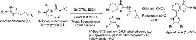 SoonafterthefirstreportofMeketaandWeinreb [2],aconcisetotalsynthesisofageladineAinjusttwostepswaspublishedbyShenguleandKaruso inthesameyear(Scheme2) [3].Theyachievedthisshorterrouteforthe synthesisof 1 byexploitingaPictet-Spengler-typecondensationbetween 2-aminohistamine(15)and N-Boc-4,5-dibromo-2-formylpyrrole(16)as thekeystep.Thestartingmaterial 15 iscommerciallyavailableorcanbepreparedfromBoc-guanidineand β-alanineasperreportedmethods [16,17] Similarly,4,5-dibromo-2-formylpyrrole(16)isalsocommerciallyavailable, andcanbeeffectedinnearquantitativeyieldfrom2-formylpyrroleintwo steps [18].Pictet-Spengler-typecondensationbetween2-aminohistamine (15)and N-Boc-4,5-dibromo-2-formylpyrrole(16)wascarriedoutbystirring thereactantsinethanolatroomtemperaturefor5hinthepresenceof theLewisacidcatalystSc(OTf)3 tofurnish N0 -Boc-50 -(2-amino-4,5,6,7tetrahydroimidazo[4,5-c]pyridine-4-yl)-20 ,30 -dibromopyrrole(17;yellow solid)in44%yield.Dehydrogenationanddeprotectionof 17 werecleanly
