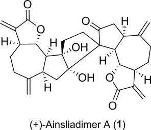 (+)-AinsliadimerA(1),aguaianolidesesquiterpenedimerisolatedfrom theChinesemedicinalplant A.macrocephala,bearsauniqueheptacyclicring systemhaving11contiguousstereogeniccentersandahighlyfunctionalized cyclopentaneringwiththreequaternarycarbonsconnectingthetwomonomericsesquiterpenelactoneunits.Theseuniquearchitecturalfeaturescombinedwithitspotentinhibitoryeffectagainstnitricoxide(NO)production madethismoleculeasanidealtargetfortotalsynthesis.Leiandhisgroup [2] reportedthefirsttotalsynthesisof(+)-ainsliadimerAstartingfrom α-stantoninbasedonaconciseandbiomimeticapproachinvolving14 steps—ahydrogenbonding-promoted[4+2]-hetero-Diels-Alderdimerizationisthekeystepofthesyntheticstrategy(Scheme1).Thesynthetic approachdemonstratedthefeasibilityofusingnonenzymaticconditions toachievetheproposedbiosynthesispathofthenaturalproduct 1 [1].