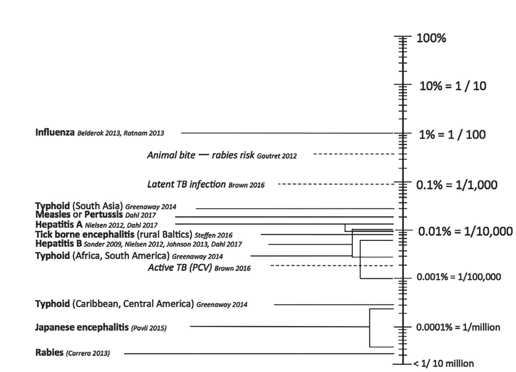 For several potentially vaccine-preventable diseases, the risk of infection is less than one per million. Although a few dozen cases of Japanese encephalitis have been diagnosed in civilian travelers during the last 25 years, the attack rate of sy mptomatic disease in civilians is estimated to be 1 per 400,000–1,000,000. Sixty percent of these cases occurred in tourists, including some short-term travelers to Bali and Thailand.49