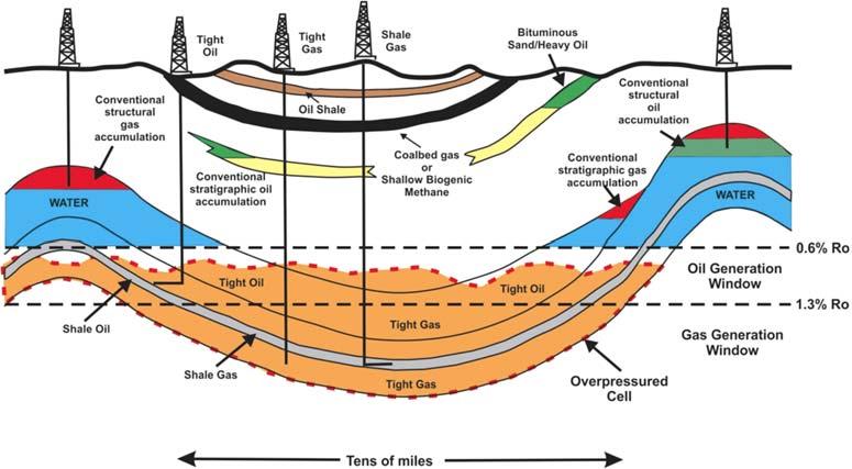 Figure1.5 Schematicofconventionalandunconventional(shale,coalbedmethane,oilshale) hydrocarbonaccumulations(SonnenbergandMeckel,2017).