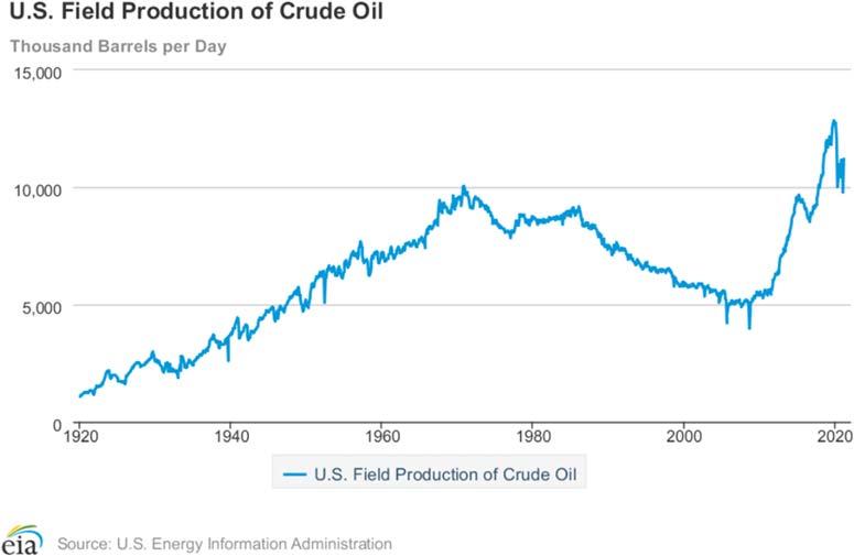 Figure1.1 1920 2020USfielddailyproductionofcrudeoil(USEIA).