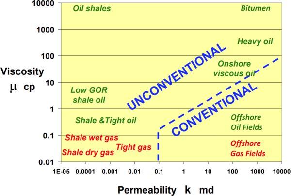 Cander(2012) arguedthatPetroleumResourceTriangledefinesunconventional reservoirsqualitativelyasdifficultresourcestodevelop.Hedelineatedtheconventional andunconventionalreservoirsbasedontherockandfluidproperties rockpermeability(k),fluidviscosity(μ),andreservoirpressure whicharecriticalforunderstandingthehydrocarbonfluidmobilityinoilandgasreservoirs.Carterplotted permeabilityvs.viscosityanddefinedunconventionalreservoirsquantitivelyas resourcesinwhichtechnologymustbeusedtoincreasethemobilityratio(k/μ)in ordertoachievecommercialflowrates(Fig.1.7).