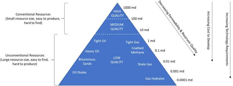 Anotherwaytoexplainthedifferencebetweenconventionalandunconventional reservoirsisthroughthePetroleumResourceTriangle,originallyprovidedby Masters (1979).Theconventionalresources,theapexoftheresourcetriangle(Fig.1.6),