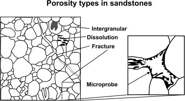 Ingeneral,thenatureofthedistributionofthegrainsizeofarockdefines itstexturalmaturity.Besidestheintergranularandintragranularporespace, microporesariseinsideovergrowthsorcement(Fig.1.1). Fig.1.1 showsthe typicalporetypesthatarisewithinsandstones.