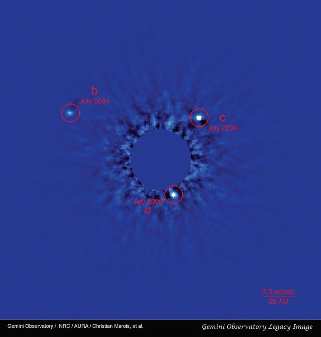 Plate 4. Adaptive optics image of the HR 8799 system, showing the first three exoplanets discovered (b, c, d) by the U.S. Gemini North telescope (Courtesy of Gemini Observatory/NRC/AURA/Christan Marois, et al.).