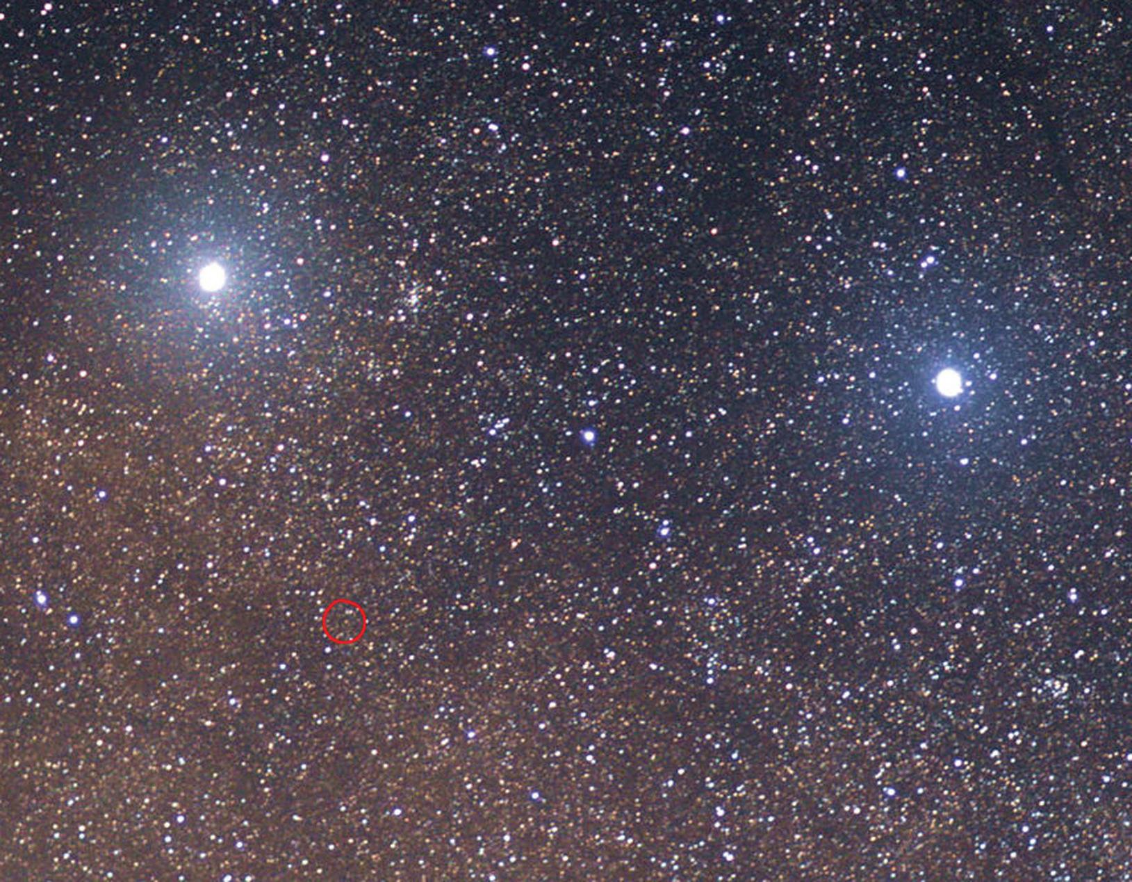 Plate 8. The Alpha Centauri triple star system, consisting of Alpha Centauri A (left), Alpha Centauri B (right), and Proxima Centauri (faint star inside red circle), the closest stars to the Solar System (Courtesy of Skatebiker at English Wikipedia).