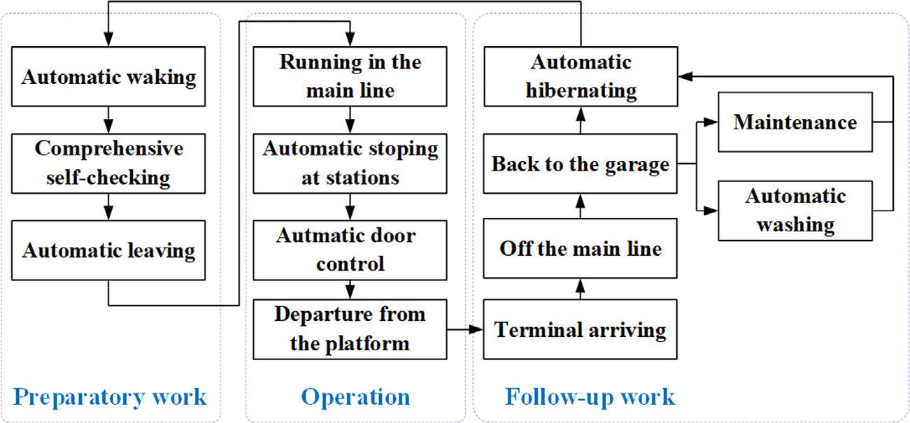 Automatictrainshavefunctionssuchasautomaticwake-up,garagedeparture,departure,travel,stop,return,andautomaticreturntothegarage,automaticwashing,andautomaticdormancyafteroperation.Fullyautomatic systemsaredesignedtomaketrainsrunmorereliablyandachieveautomatic controloftheentiresceneandprocess.ComparedwiththeATOmode,in whichtheoperatinglineshavebeenopenedinthepast,thedegreeofautomationismuchhigherinUTOmode,inwhichthereliability,applicability, maintenance,andsecuritycanbequantified [15].
