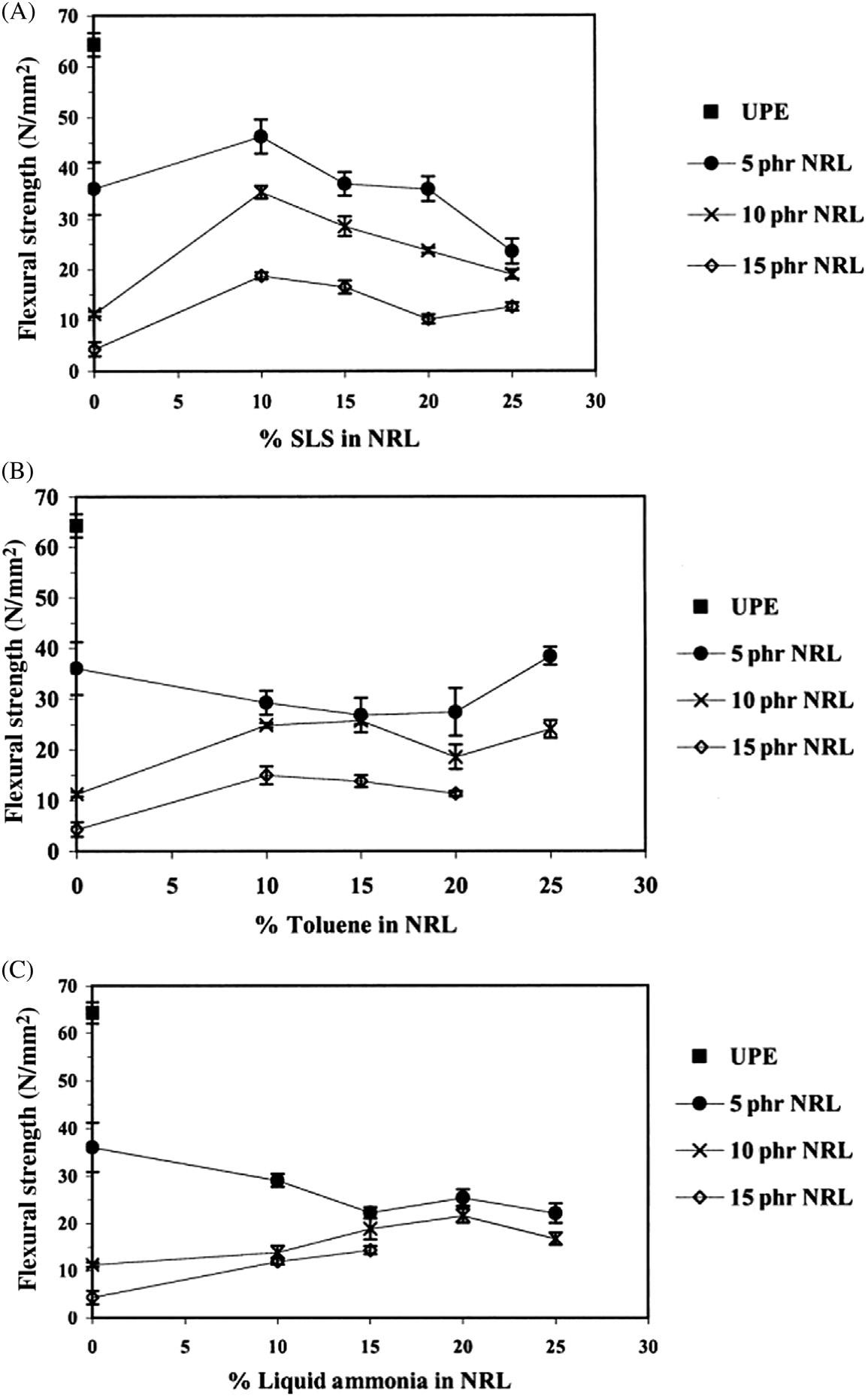 ImpactstrengthofpureUPRandUPR/NRLblendsusingdifferentdispersionaids:(A)usingSLSasadispersion aid;(B)usingtolueneasadispersionaid;and(C)usingliquidammoniaasadispersionaid.