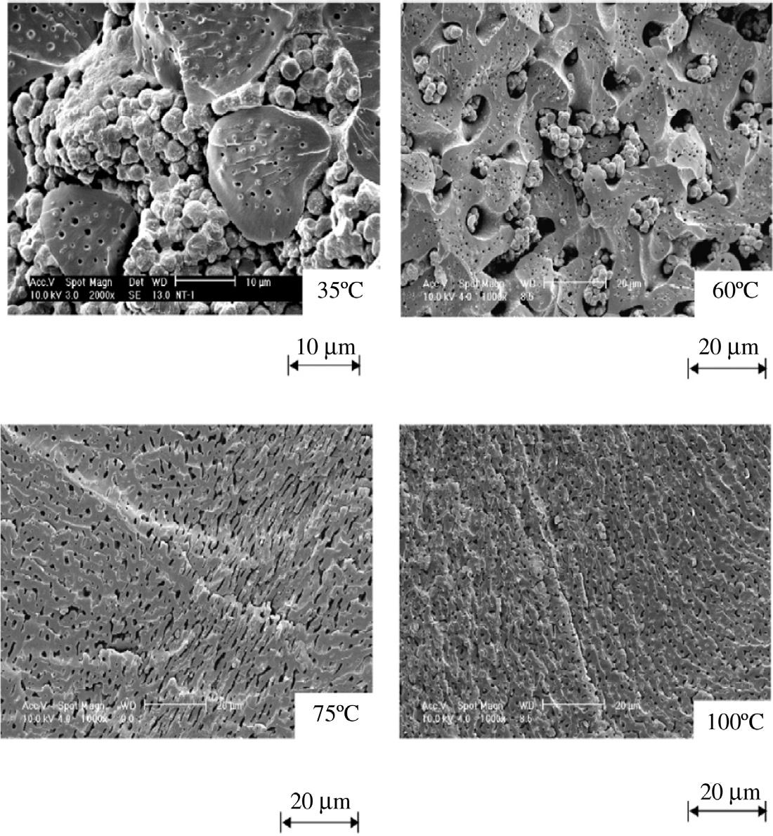 Ruffieretal.performedasimulationtoshowtheconnectionbetweenvoidsscatteredinsidethe UPR polyvinylacetateblendandtheblendphaseseparationmechanism [60].Theeffectofcuring temperatureonthemorphologyofUPR/styrene/PVAcblendswith5%and10%PVAccured between75 Cand150 Cwasstudied.Acocontinuousphaseseparatedstructureresultedfor10% PVAc.Aninsignificantchangeinmorphologywithcuringtemperaturewasobservedforthiscomposition [61].