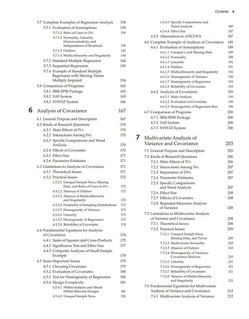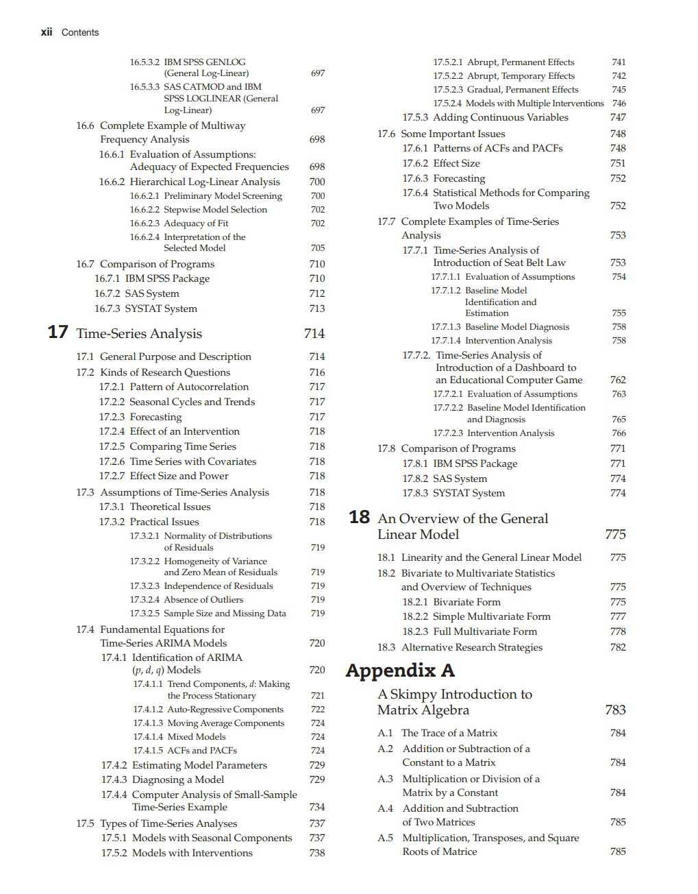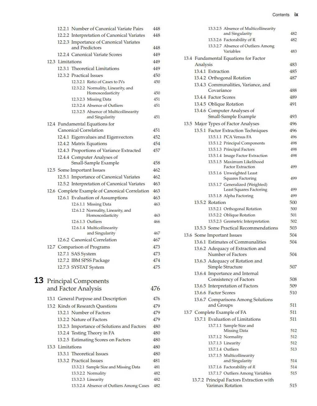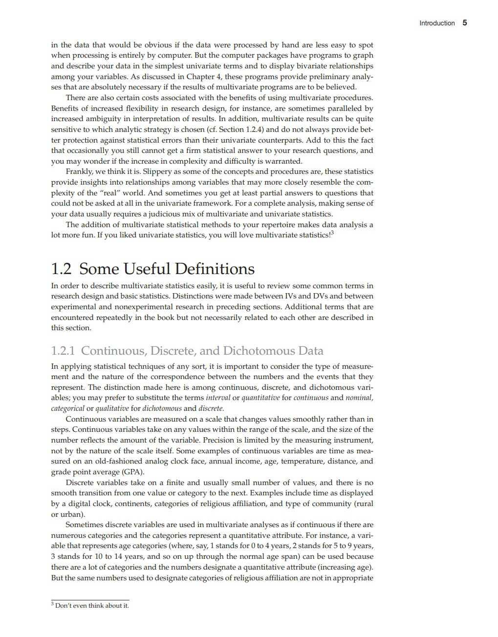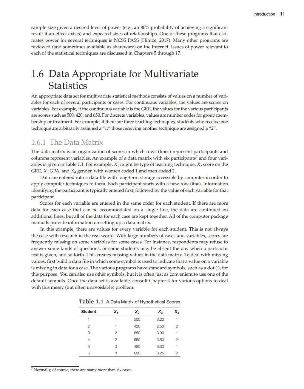 simp le te r ms an d s h ows th ei r deve lopmen t fr o m a ve r y s m all da ta set. Append ix A descr ibes some te rms and m anip u la ti ons appropria te to matrices. In the fo u r t h sections o f Cha p ters 5 through 17, a sma ll h yp o thetical sa mp le o f d a ta is analyzed b y h and to show h ow the wei ghts a re d er ived for each analysis. Thou g h this infor ma ti on is u seful for a basic unders tanding of m u l tiva ria te s ta tistics, it is not n ecessa r y fo r applying m u l ti va ria te techniqu es fru itfull y to your resea rch q u esti ons a n d may, sad ly, b e skipped by those w h o a re ma th aver se.