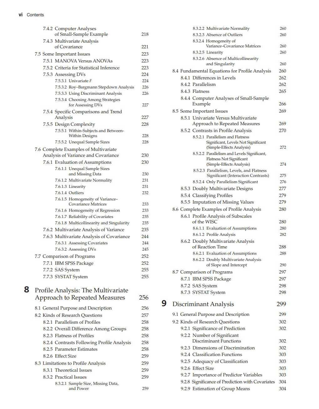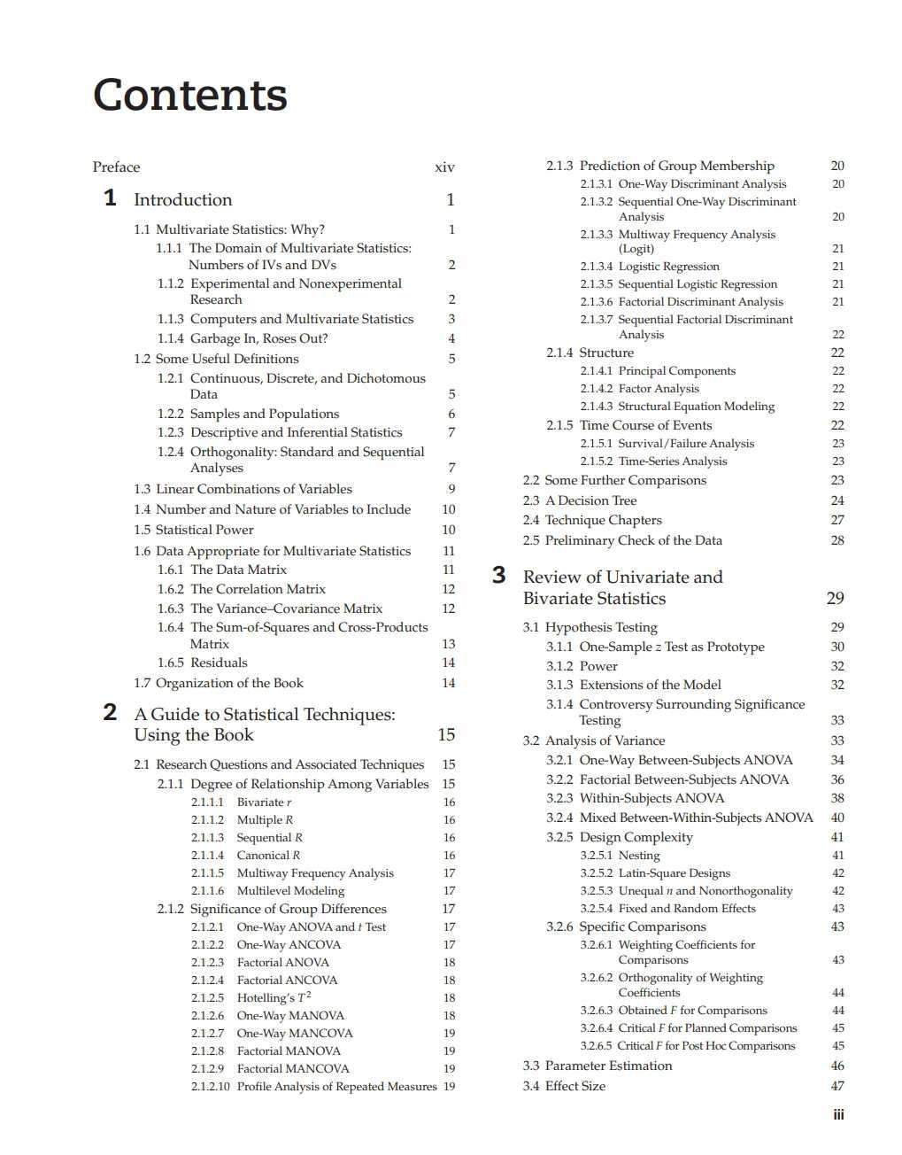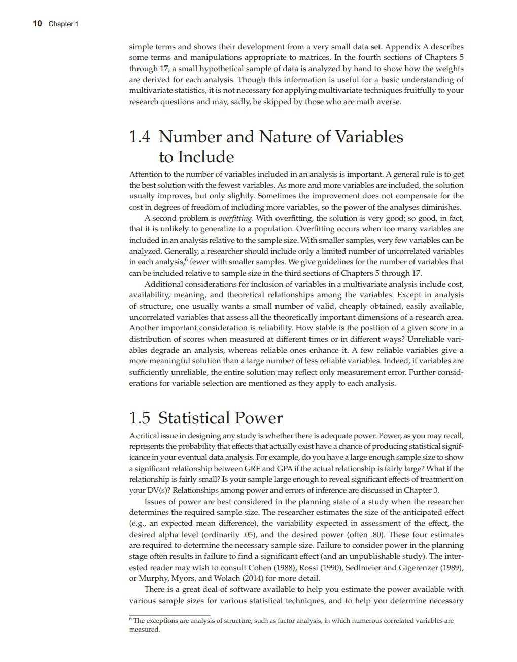 Th e re a re also certa in costs associ a ted w i th the benefi ts of usin g m u l ti variate p roced u res. Benefi ts o f in creased fle xi bi li ty in research des ign, for in s ta n ce, are som etim es pa ralleled b y in creased ambiguit y in in te rp retati on o f resul ts. In add iti on , mu l tivar ia te res u l ts can be q ui te sensi tive to whi ch a n a lyti c s trategy is chosen (cf. Section 1.2.4) and d o not a l ways prov ide better p rotection again s t s tatisti ca l errors than thei r u ni va riate cou nter par ts. Add to t his the fac t tha t occas iona ll y you s till cannot ge t a firm statis ti ca l a n swer to your research q u es ti ons, a nd you m ay wond er if th e increase in complex i ty and diffi cu lty is war ranted.