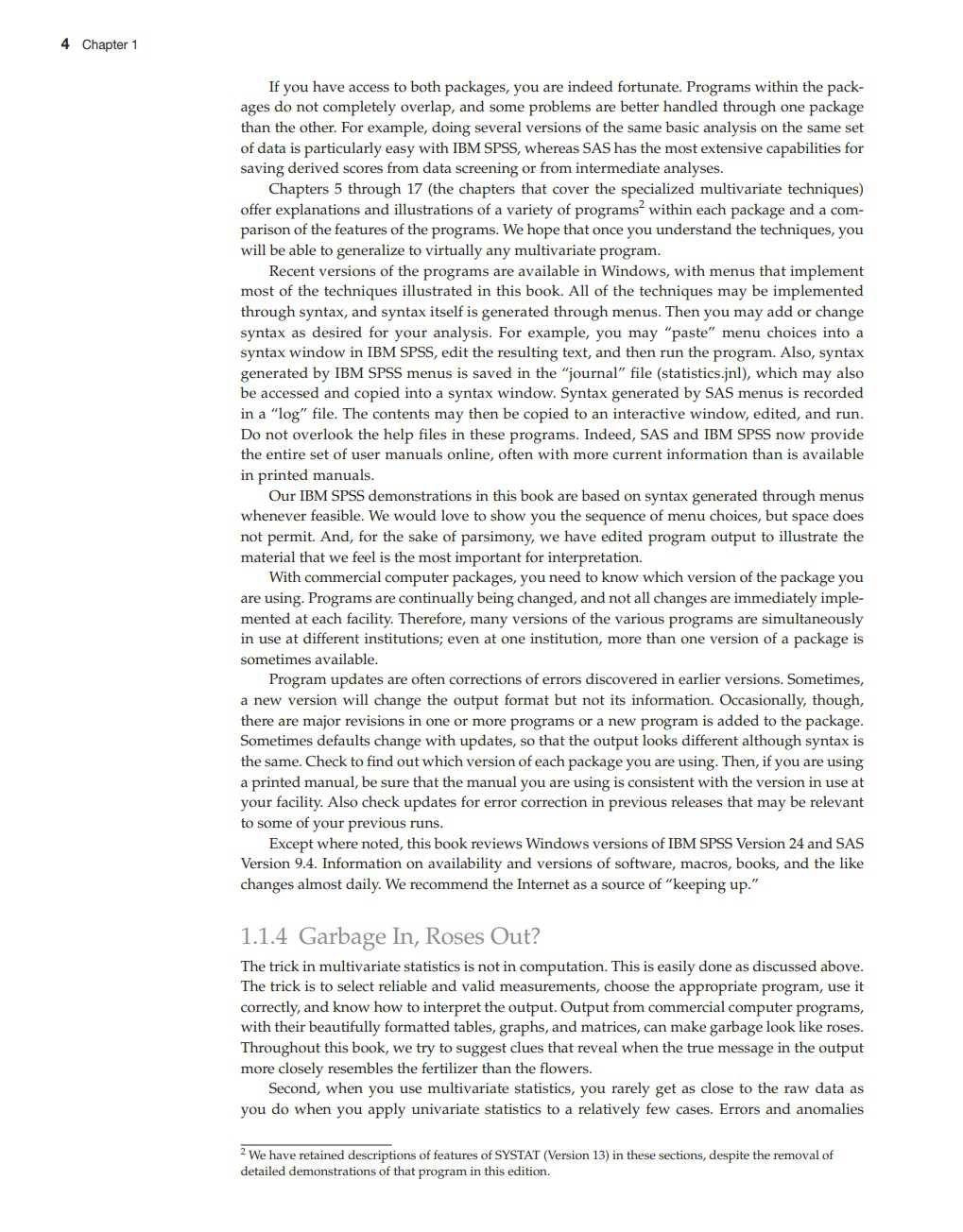 C hap ter s 5 thro u g h 17 (the chap te rs th a t cover th e specialized m ulti va ria te techni ques) offer expl anations an d ill ustra ti ons of a variety of p rogra m s 2 wi thi n each package and a co mpa r ison of the fea tu res o f the p r ogra ms. We hop e tha t once you un derstand the techniques, you wi ll b e a bl e to generalize to v i r tua ll y any multiva riate progra m