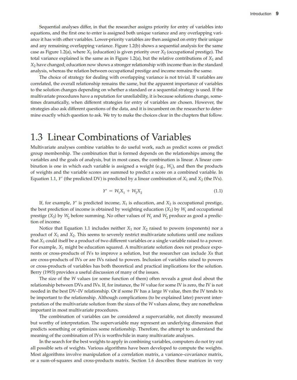 Mu lti varia te a n a lyses combine variables to do usefu l work, s u ch as p red ict scores o r p red i ct grou p memb e rship. The comb inati on that is fo r med depends on th e rela ti onships among the variab les and th e goals of analys is, bu t in most cases, th e combina ti on is lin ear. A linear combina ti on is one in w hi ch each variab le is ass ig n ed a we ight (e.g., W1), and then the p roduc ts of weights and the va r iab le sco res are s u mmed to pred ict a score on a combin ed va ri ab le. In Equ ati on 1.1, Y' ( the pred icted DV) is predic ted by a l in ea r combin a ti on of X1 and X2 ( the IVs).