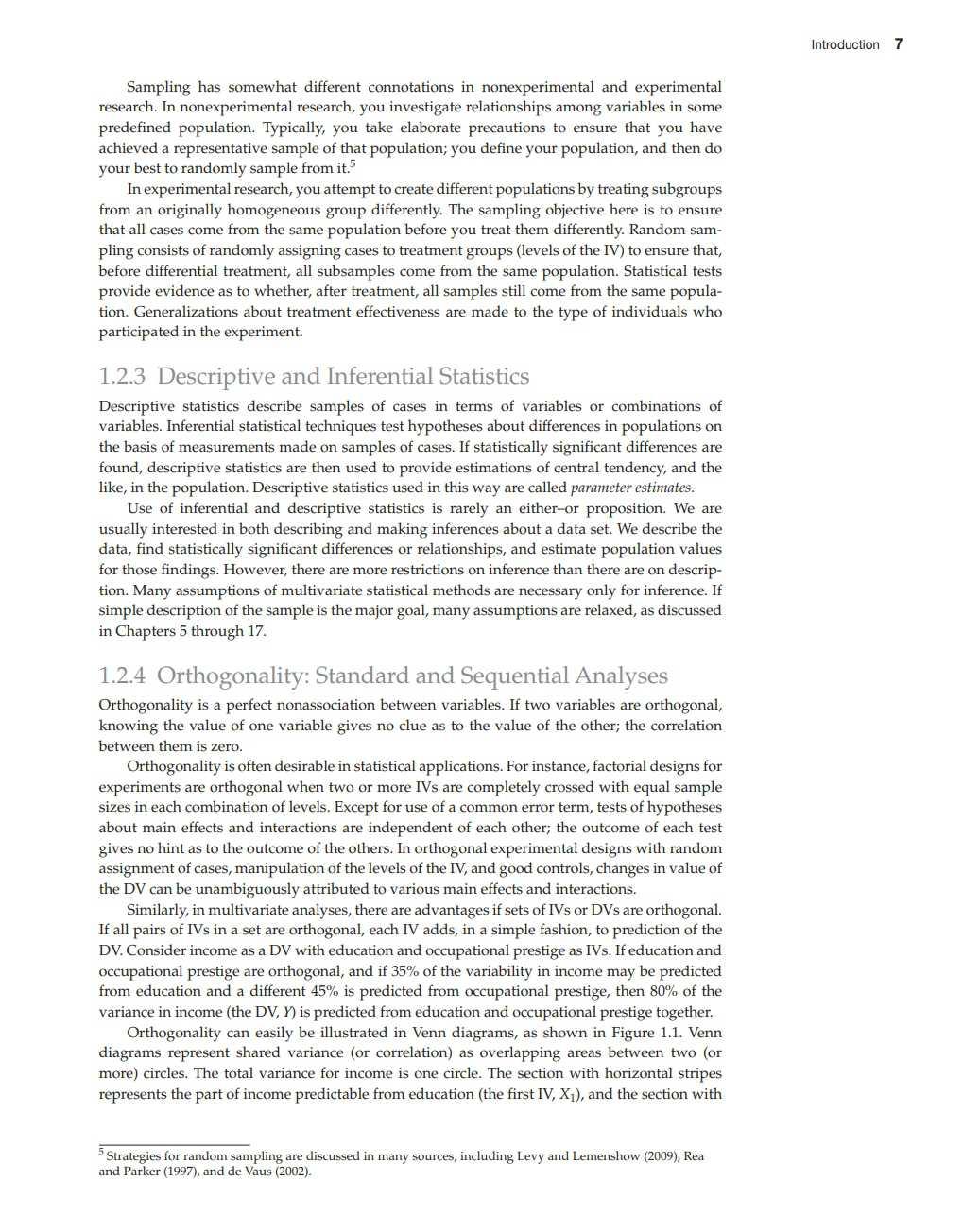 Simila rl y, in mul ti varia te ana lyses, the re are a d vantages if sets o f IVs or DVs are o rthogonal. If a ll pairs of IVs in a set are o rthogonal, each IV a d ds, in a simp le fashion, to p red ic ti on of th e DV. C ons ider in com e as a DV w ith e d uca tio n and occu p ational p res ti ge as IVs. If ed u ca tion a nd occu pa tional p restige a re orthogonal, and if 35% of t h e va riabili t y in in come m ay be p red icted fro m ed u ca ti on a nd a d iffere n t 45% is pred icted fro m occu pa ti on a l prestige, then 80% of the var iance in income (the DV, Y) is predicted fr o m edu cation and occu p a tional p res ti ge together.