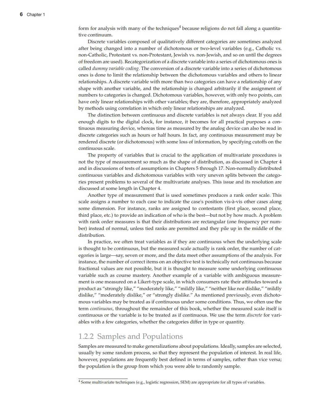 In p r ac tice, we often trea t varia b les as if th ey a re con tinu ous w h en the u n derl y ing scale is though t to be con tinu ous, bu t the m eas ured sca l e actu a ll y is r a nk o rd e r, the n um be r of ca tego ri es is large-s ay, seven o r m ore, a n d the da ta m eet o th e r assumption s o f the ana l ysis. For in s tance, th e n um be r o f correc t i te m s o n a n obj ec ti ve test is techni ca ll y not con tinu ou s beca u se fr actiona l va lu es a re n o t possib le, b u t i t is t h ou gh t to measure so m e u nd e rl yin g con tinu ous varia b le such as cou rse m as te r y. Another e xa m p le of a va riab le w i th a mbi guou s measurem en t is one m eas ure d on a Like rt - t ype sca le, in which cons ume rs ra te th e ir a ttitud es towa rd a p roduc t as "s tro n g ly l ike," " m ode ra te ly like," " mil d l y li ke," "nei the r like nor dis li ke," " mil d ly disl i ke," " m oderately disl i ke," o r "st r ong ly d isl ike." As m en tioned previou s ly, even d ichotom ou s va riab les may b e tr eated as if con tin u ou s und er som e con d i ti ons. Th us, we o fte n u se the te rm continuous, t h rou ghou t the rem aind er of t h is boo k, w h e ther the m eas ured sca le itself is con ti n u ou s o r the va riab le is to b e treated as if con ti n u o u s. We u se the te rm discrete fo r va r ia b les w i th a few ca tegor ies, whether th e categor ies differ in t ype o r q u antity.