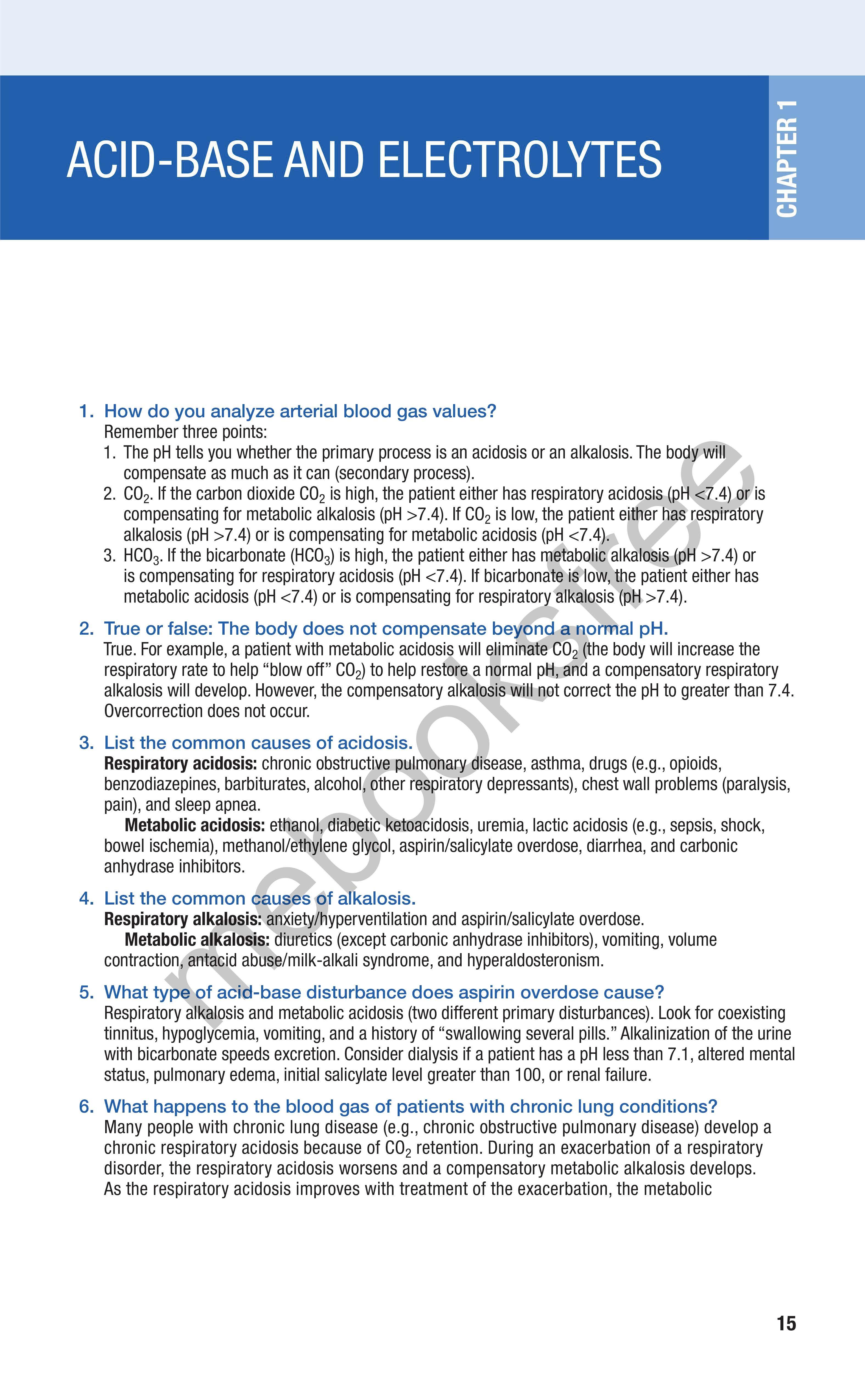 11. Arterial blood gas analysis: in general, pH tells you the primary event (acidosis vs. alkalosis), whereas carbon dioxide and bicarbonate values give you the cause (same direction as pH) and suggest any compensation present (opposite of pH).