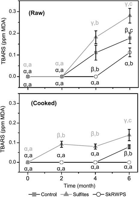 FIGURE1.6 Thiobarbituricacidreactivesubstance(TBARS)levelsinrawandcookedbeefpattiesstoredinvacuumpackagingfor6monthsat 18 C. Pointsshowmeanvaluesandbarsindicatestandarddeviationsateachsamplingpoint(n 5 3).Greekletters(α,β,γ)showstatisticaldifferencesbetween samplesatthesamestoragetime.Latinletters(a,b,c)showstatisticalchanges(P-value , .05)duringstorage.Control:pattieswithoutanyantioxidant; sulfites:pattieswith300ppmofSO2;andSkRWPS:pattieswith2g/100gofseasoningobtainedskinfractionofredwinepomace. FromGarcı´a-Lomillo, J.,Gonzalez-SanJose,M.L.,DelPino-Garcı´a,R.,Ortega-Heras,M.,Muniz-Rodrı´guez,P.,2017.Antioxidanteffectofseasoningsderivedfromwine pomaceonlipidoxidationinrefrigeratedandfrozenbeefpatties.LWT—FoodSci.Technol.77,85 91,withpermissionfromElsevier.