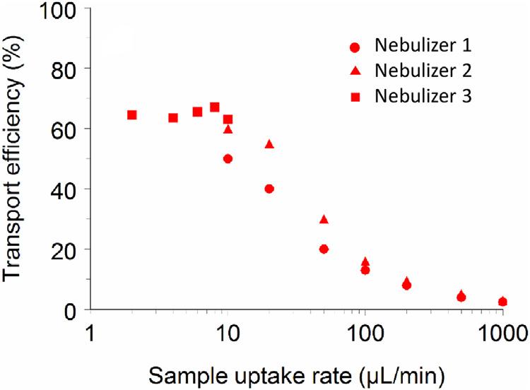 Inthecaseofplasmas,deploymentofexpensivelow-flownebulizers operatingbelow10 μLmin 1 canachievesome60%sampleutilization efficiency.OperationofconventionalnebulizersatmLmin 1 uptake ratesresultsingenerationofhighprimarydropletdensitiesinspray chambersandtheirrapidcoalescencetoyieldquitelowtertiaryaerosol outputsontheorderofafewpercent [8].Thetertiarydropletsample fraction,capableofbeingtransportedtotheatomizer,isthendesolvated tosubmicron-sizeddryparticleswhich,iftypicallysmallerthan200nm indiameter,arevaporizedwithhighefficiency(β v B1)inhightemperatureplasmas [10 12].Thisisnotalwaysthecaseinflamesas