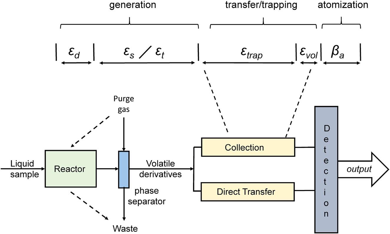 Duringthe generation stage,theliquidsample(slurrieshavealsobeen processed [24])canbeintroducedintothereactorviaseveralmeans, includingfromacontinuousorflowinjectionsystem,aseffluentfroma chromatographicdevice(highperformanceliquidchromatography,ion chromatography,capillaryelectrophoresis,gaschromatography[GC], etc.)orbydiscreteinjection.Clearly,theefficiencyofthisprocessis unity(equivalentto εin 5 1)andrequiresnofurtherconsideration.