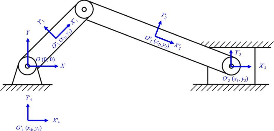 Intheplanarslider-cranksystem,eachbodyhasthreeDOFs(xi, yi, φi);thegeneralized coordinatesareexpressedinvectorformas